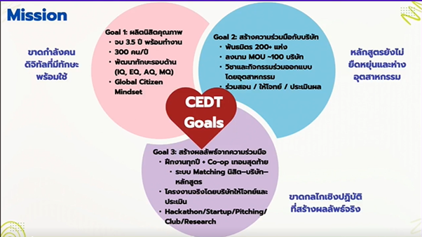 เป้าหมาย: การพัฒนากำลังคนสมรรถนะสูงที่ตรงกับความต้องการของผู้ช้บัณฑิต (เช่น ภาคอุตสาหกรรม เทคโนโลยีใหม่ หรือพื้นที่เฉพาะทาง) และนวัตกรรมการจัดการศึกษา