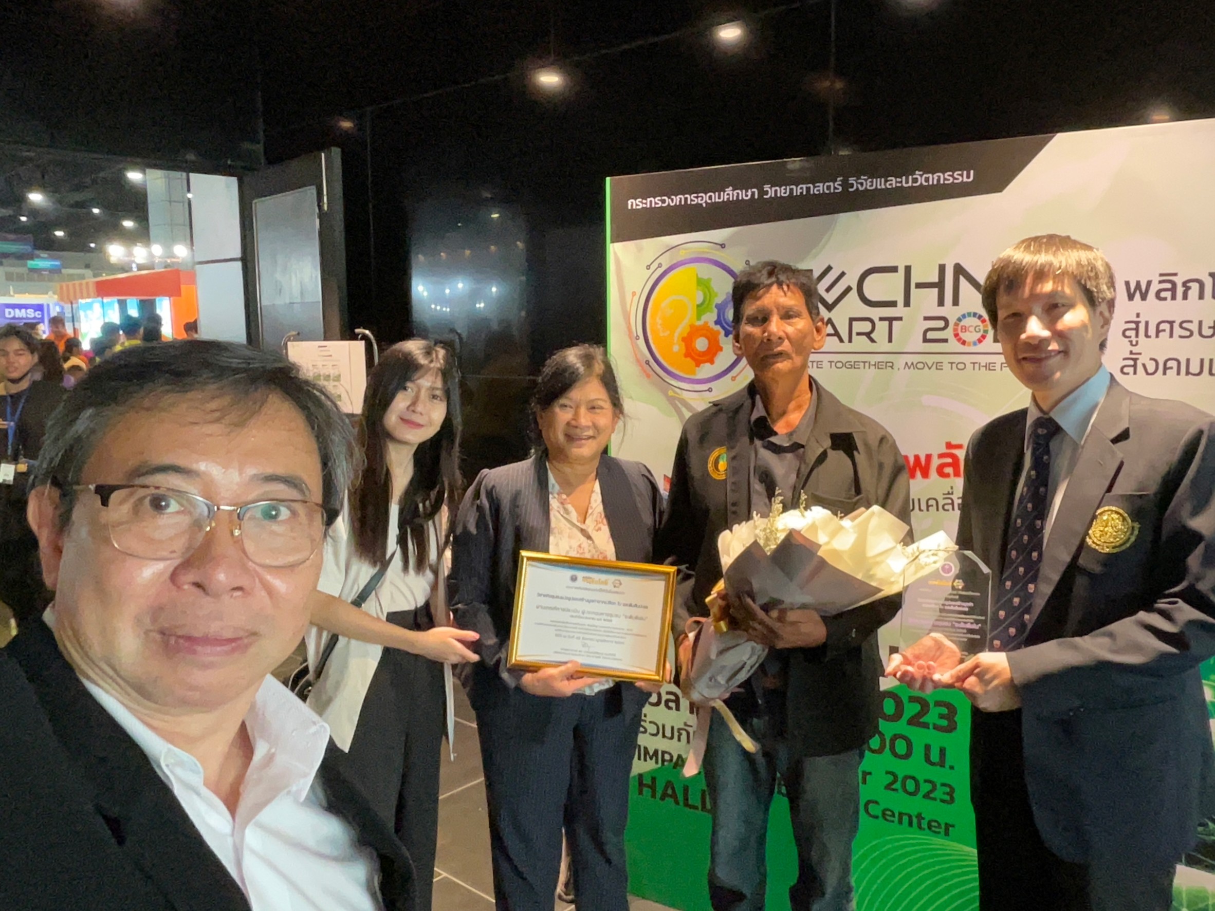 ไตรมาส 3 กิจกรรมที่ 3.3 วันที่ 11 มิถุนายน 2566 ที่ปรึกษาคลีนิคเทคโนลยี มหาวิทยาลัยเทคโนโลยีพระจอมเกล้าธนบุรี เสนอการเข้าร่วมการแข่งขัน ด้านการพัฒนาขีดความสามารถทางธุรกิจ โดยนำผลงานเครื่องตีใบสับปะรดเพื่อแยกเส้นใย วิสาหกิจชุมชนกลุ่มผลิตเส้นใยธรรมชาติบ้านคา จังหวัดราชบุรี ที่ได้รับการสนับสนุนเบื้องต้นจากโครงการเพิ่มศักยภาพธุรกิจชุมชน (BCE) มหาวิทยาลัยเทคโนโลยีพระจอมเกล้าธนบุรี ในปี 2564- 2565 และต่อยอดพัฒนาเพื่อใช้เป็นเครื่องมือในการประกอบธุรกิจ เพื่อสร้างมูลค่าเพิ่มให้เส้นใยจากใบสับปะรด จากการผลิตด้วยเครื่องเดิมที่ขายเส้นใยได้ในราคากิโลกรัมละ 260 บาท เมื่อนำมาผ่านเครื่องที่พัฒนาใหม่ จะได้ผลิตภัณฑ์เส้นใยทีมี ราคากิโลกรัมละ 360- 400 บาท โดยเข้าร่วมกิจกรรม ในโครงการประกวดรางวัล WESP Innovation Awards 2023 ในระดับภูมิภาค จัดโดยอุทยานวิทยาศาสตร์ภาคตะวันออก มหาวิทยาลัยบูรพาและสำนักอุทยานวิทยาศาสตร์และอุตสาหกรรม มหาวิทยาลัยเทคโนโลยีพระจอมเกล้าธนบุรี ระหว่างวันที่10 -11 มิถุนายน 2566 ณ.อาคารศูนย์การเรียนรู้การเงินและ การลงทุนธุรกิจระหว่างประเทศ มหาวิทยาลัยบูรพา จังหวัดชลบุรี มีวัตถุประสงค์ของกิจกรรม เพื่อเชิดชูเกียรติหน่วยงาน/บุคคลตัวอย่าง ที่สามารถพัฒนาขีดความสามารถทางธุรกิจ ให้สังคมเห็นถึงคุณค่าและสร้างความตระหนักของการนำวิทยาศาสตร์ เทคโนโลยี และนวัตกรรมไปปรับใช้จริง และส่งเสริมให้นำไปสรรสร้างธุรกิจที่มีศักยภาพ ทั้งในการพัฒนาผลิตภัณฑ์ กระบวนการ รวมไปถึงการเป็นนักธุรกิจนวัตกรรมที่ดำเนินธุรกิจนั้นได้อย่างยั่งยืน การดำเนินงาน ให้วิสาหกิจชุมชน ผู้ผลิตเส้นใยธรรมชาติบ้านคา คัดเลือกตัวแทนเข้าร่วมการแข่งขัน จำนวน 3คน ได้แก่ นายสมชาย อุไกรหงษา นายสุรินทร์ วิจารญ์สิทธิ์ และนายสมพร ศรีสงคราม เข้าร่วมการแข่งขัน พร้อมด้วย ดร. วรวิทย์ โกสลทิพย์ และ ผศ ดร ทัศวัลย์ คัมภีระพันธุ์ ทำการจัดแสดงตัวอย่างเครื่องจักร และชิ้นงาน รวมทั้งจัดทำข้อมูลและการนำเสนอผลงาน ให้แก่วิสาหกิจชุมชนฯ เพื่อเข้าร่วมแข่งขัน ผลการดำเนินงาน ได้รับรางวัลชมเชย ในสาขานวัตกรรมเชิงพาณิชย์ โดยได้รับรางวัลเป็นเงินสดจำนวน 5000 บาท และมอบให้ ตัวแทน วิสาหกิจชุมชนฯ ที่เข้าร่วมประกวด เพื่อเป็นทุนในการดำเนินธุรกิจต่อไป และคณะกรรมการให้คำแนะนำ ในการ ต่อยอดเครื่องจักร คือให้ ปรับปรุงเป็นระบบอัตโนมัติ เพื่อลดการใช้แรงงานคน และได้ผลผลิตที่รองรับความต้องการของตลาดได้อย่างครบถ้วน
