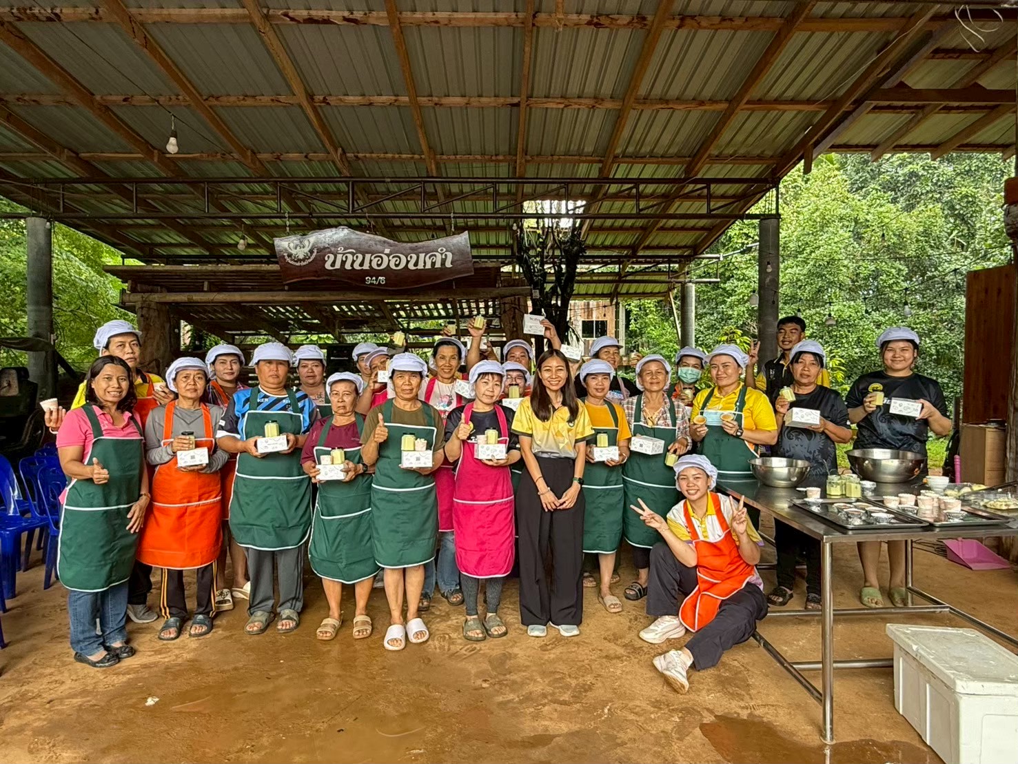 ผล ด้านการออกแบบลวดลายและพัฒนาผลิตภัณฑ์จากผ้าด้วยเทคนิคมัดย้อม -ได้เรียนรู้การออกแบบลวดลายด้วยเทคนิคการมัดย้อม กระบวนการในการมัดย้อมให้ได้ลายหลากหลายและมีสีสันสวยงาม จำนวน 10 ลวดลาย -สามารถผลิตผ้ามัดย้อมได้จริง พร้อมตัวอย่างผลงานจำนวน 30 ชิ้นงาน -ได้เรียนรู้สีย้อม 2 ชนิด ได้แก่ สีย้อมจากธรรมชาติและสีย้อมเคมี -ได้รับเอกสารคู่มือการเรียนรู้เรื่องการมัดย้อมและสีย้อม เพื่อใช้ฝึกฝนต่อยอดด้วยตนเอง ด้านการแปรรูปและพัฒนาผลิตภัณฑ์จากผลไม้ท้องถิ่น -มีการสาธิตและฝึกปฏิบัติจริงในการพัฒนาผลิตภัณฑ์จำนวน 3 ประเภท ได้แก่ ซอสทุเรียน ไอศกรีมทุเรียน และเค้กทุเรียน -ผู้เข้าอบรมทุกคนได้ทดลองแปรรูปด้วยตนเอง พร้อมทั้งทดสอบชิมและได้รับผลิตภัณฑ์ตัวอย่างกลับบ้าน -พัฒนาบรรจุภัณฑ์เบื้องต้น สำหรับผลิตภัณฑ์ที่มีศักยภาพเข้าสู่ตลาด เช่น ซอสทุเรียนในขวดสุญญากาศ, ไอศกรีมแบบพร้อมรับประทาน ด้านการแปรรูปและพัฒนาผลิตภัณฑ์ไส้กรอกและไส้อั่วสมุนไพร -องค์ความรู้ในการแปรรูปผลิตภัณฑ์ไส้กรอกและไส้อั่วสมุนไพร จำนวน 2 องค์ความรู้ -สูตรผลิตภัณฑ์ไส้กรอกและไส้อั่วสมุนไพรที่พัฒนาแล้ว 2 สูตร -ผลิตภัณฑ์ต้นแบบของไส้กรอกและไส้อั่วสมุนไพร จำนวน 2 ชิ้น/ชุด ด้านการใช้สมุนไพรท้องถิ่นเพิ่มมูลค่าผลิตภัณฑ์สำหรับสูดดม ทา ถู นวด -ผลิตภัณฑ์ต้นแบบที่พัฒนาจากสมุนไพรท้องถิ่น ได้แก่ ยาดมสมุนไพร, ยาหม่องน้ำ, สเปรย์กันยุง 1) สูตรไม่ผสมแอลกอฮอล์ 2) สูตรผสมแอลกอฮอร์ จำนวน 1 ชิ้น/สูตร -ได้สูตรการผลิตที่ได้มาตรฐานและปลอดภัย 4 สูตร