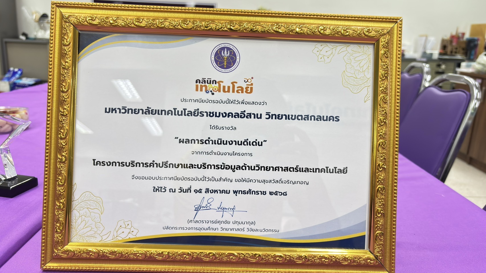 คลินิกเทคโนโลยี มหาวิทยาลัยเทคโนโลยีราชมงคลอีสาน วิทยาเขตสกลนคร ได้รับ โล่รางวัลที่สุดคลินิกเทคโนโลยีเครือข่ายระดับภาคตะวันออกเฉียงเหนือ และ เกียรติบัตรผลการดำเนินงานดีเด่น จากการดำเนินงาน โครงการบริการคำปรึกษาและบริการข้อมูลด้านวิทยาศาสตร์และเทคโนโลยี (คลินิกเทคโนโลยี) ภายใต้การจัดกิจกรรม Science Research and Innovation (SRI) NETWORK TOWNHALL ณ เวทีกลาง ชั้น G ศูนย์การประชุมแห่งชาติสิริกิติ์ กรุงเทพมหานคร รายงานโดย น.ส.ชลาลัย เหง้าน้อย วันที่รายงาน 19/08/2568 [19728] |