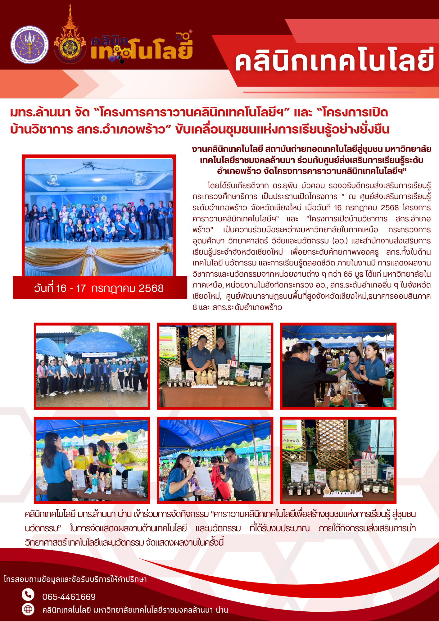 คลินิกเทคโนโลยี มทร.ล้านนา น่าน เข้าร่วมกิจกรรมจัดนิทรรศการในกิจกรรมงาน ”คาราวานคลินิกเทคโนโลยีเพื่อสร้างชุมชนแห่งการเรียนรู้ สู่ชุมชนนวัตกรรม“ ประจำประ 2568 ในวันที่ 16-17 กรกฎาคม 2568 ณ ศูนย์ส่งเสริมการเรียนรู้ระดับอำเภอพร้าว อำเภอพร้าว จังหวัดเชียงใหม่ โดยมีเป้าหมายเพื่อเสริมสร้างความรู้และทักษะด้านเทคโนโลยี ให้แก่บุคลากรของ สกร. และประชาชนในพื้นที่อำเภอพร้าวและใกล้เคียง ให้สามารถนำเทคโนโลยีไปประยุกต์ใช้ในการดำเนินชีวิตประจำวัน การประกอบอาชีพ และการพัฒนาผลิตภัณฑ์ชุมชน และกระตุ้นให้เกิดการเรียนรู้และพัฒนาตนเองอย่างต่อเนื่อง พัฒนาทักษะอาชีพ และการสร้างชุมชนแห่งการเรียนรู้ที่เข้มแข็ง สร้างความตระหนักถึงความสำคัญของการศึกษา: การเรียนรู้ตลอดชีวิตในการพัฒนาตนเอง ชุมชน สังคมและประเทศชาติอย่างยั่งยืน รายงานโดย นางสาวศศิภา ชุมภูธิมา วันที่รายงาน 22/09/2568 [20044] |