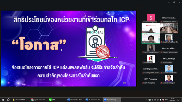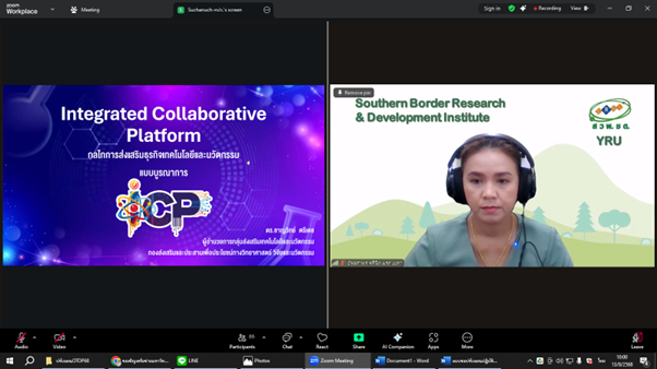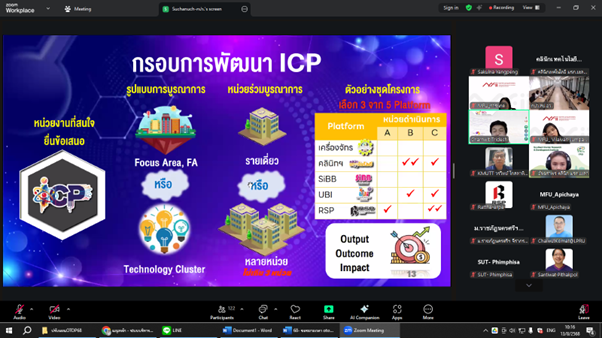 วันที่ 13 สิงหาคม 2568 เวลา 10.00 น. คลินิกเทคโนโลยี มหาวิทยาลัยราชภัฏยะลา นำโดย อาจารย์ ดร.อัจฉราพร ยกขุน ผู้จัดการคลินิกเทคโนโลยี พร้อมนางสาวลักษ์ขณาวดี ชุ่มแก้ว เจ้าหน้าที่บริหารงานทั่วไป คลินิกเทคโนโลยี เข้าร่วมรับฟังการชี้แจงหลักการกลไก ICP และการสมัครเข้าร่วมกลไกการส่งเสริมธุรกิจเทคโนโลยีและนวัตกรรมแบบบูรณาการ (Integrated Collaborative Platform - ICP) คือ กระบวนการที่ใช้ผลักดันให้เกิดการนำวิทยาศาสตร์ เทคโนโลยีและนวัตกรรมไปใช้ประโยชน์ โดยการบริหารจัดการงบประมาณในแพลตฟอร์มต่าง ๆ ดำเนินการภายใต้พื้นที่มุ่งเน้น (Focus Area) หรือ Technology Cluster ให้เกิดผลลัพธ์/ผลกระทบในวงกว้างและชัดเจน ผ่านระบบออนไลน์ Zoom Meeting ซึ่งจัดโดยกลุ่มส่งเสริมเทคโนโลยีและนวัตกรรม กองส่งเสริมและประสานเพื่อประโยชน์ทางวิทยาศาสตร์ วิจัยและนวัตกรรม สำนักงานปลัดกระทรวงการอุดมศึกษา วิทยาศาสตร์ วิจัยและนวัตกรรม รายงานโดย นางสาวลักษ์ขณาวดี ชุ่มแก้ว วันที่รายงาน 17/09/2568 [19971] |