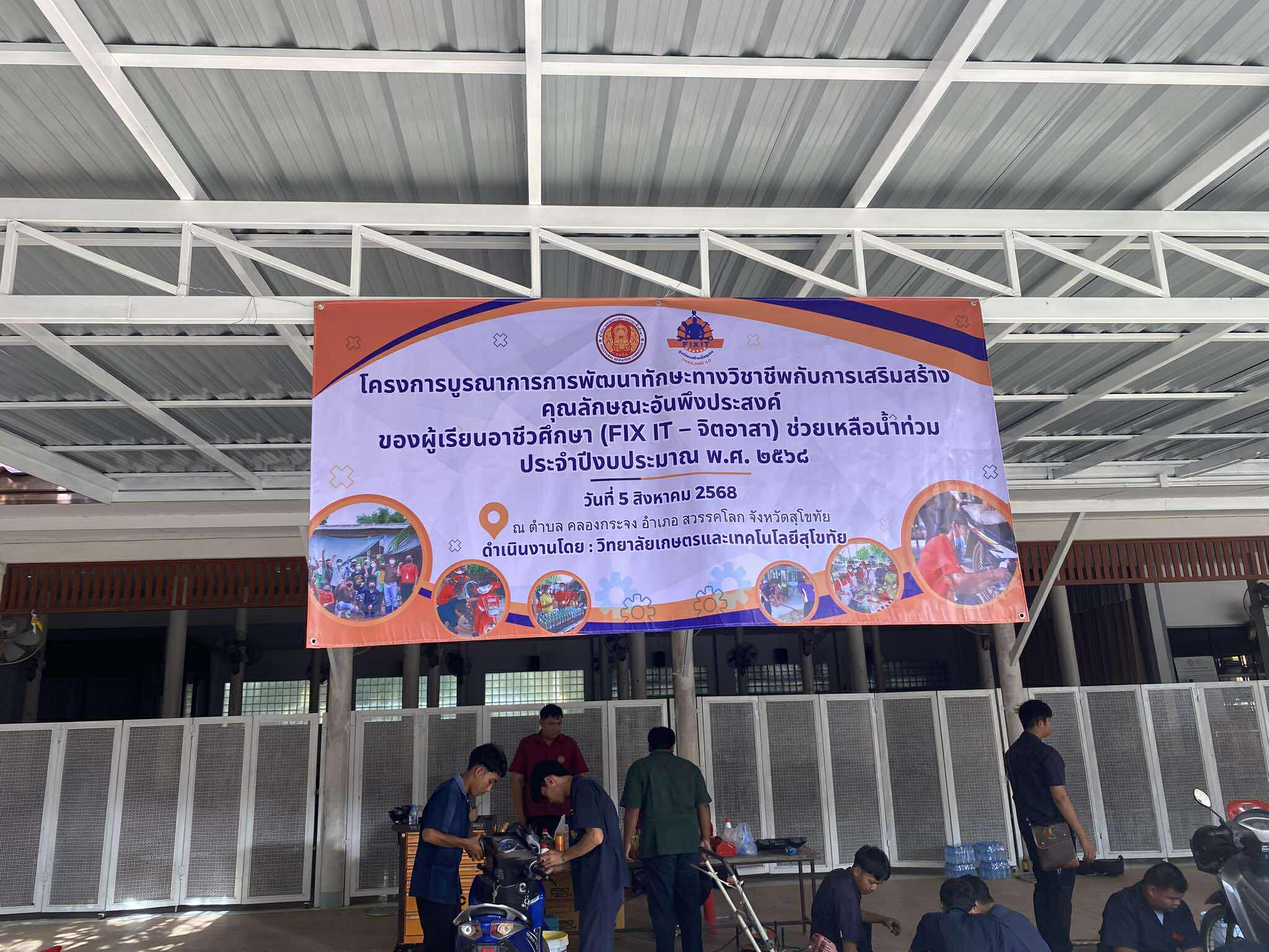โครงการบริการให้คำปรึกษาและข้อมูลเทคโนโลยีแก่ชุมชนองค์ความรู้ การขยายจุลินทรีย์สังเคราะห์แสง จุลินทรีย์ EM และการปลูกต้นกล้าผักสวนครัว ร่วมกับโครงการบูรณาการการพัฒนาทักษะทางวิชาชีพกับการเสริมสร้างคุณลักษณะอันพึงประสงค์ ของผู้เรียนอาชีวศึกษ (FIX IT – จิตอาสา) ช่วยเหลือน้ำท่วม วันที่ 5 เดือน สิงหาคม พ.ศ.2568 ณ วัดคลองกระจง ตำบลคลองกระจง อำเภอสวรรคโลก จังหวัดสุโขทัย เนื่องจากเมื่อวันที่ 28 กรกฎาคม 2568 ที่ผ่านมา เกิดน้ำท่วมขังในพื้นที่หมูบ้านคลองกระจง ทำให้ในหลายพื้นที่ของชาวบ้าน เช่น บริเวณบ้านเรือนที่อยู่อาศัย พื้นที่ทำการเกษตร วัด เกิดน้ำท่วมขัง น้ำเน่าเสีย และส่งกลิ่นเหม็น จึงได้มีการสอนขยายและใช้จุลินทรีย์ em เพื่อช่วยบำบัดน้ำเสีย และได้มีการแจกต้นพันธุ์ พริกขี้หนูสวน มะเขือจานม่วง และจิงจูฉ่าย เพื่อปลูกทดแทนต้นเก่าที่ถูกน้ำท่วมไป และมีการสอนขยายและใช้จุลินทรีย์สังเคราะห์แสงกับพืชผักสวนครัว รายงานโดย นางสาวธิภารัตน์ สำลีเติมสิริ วันที่รายงาน 14/08/2568 [19715] |