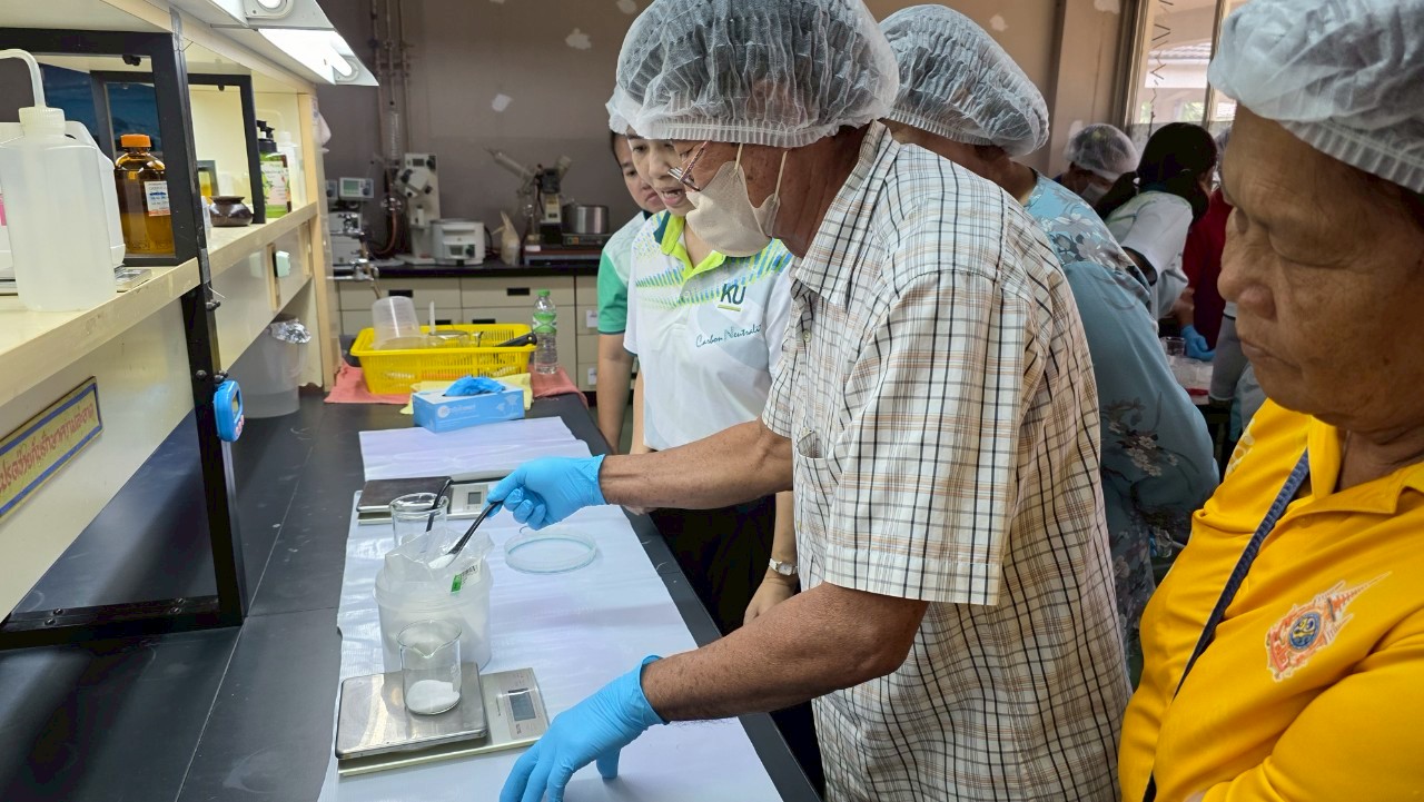 วิทยากร โดย ดร.ศศิวิมล จันทร์สุเทพ นักวิจัย หน่วยการใช้ประโยชน์จากผลิตภัณฑ์ธรรมชาติ ศูนย์ปฏิบัติการวิจัยและเรือนปลูกพืชทดลอง ผู้เข้าอบรมได้ฝึกปฏิบัติการผลิตสบู่เหลวสมุนไพรผสมสารสกัดพญายอ สามารถนำไปพัฒนาต่อยอดเป็นผลิตภัณฑ์เชิงพาณิชย์เพื่อสร้างมูลค่าเพิ่มให้แก่สมุนไพรที่ปลูกโดยวิสาหกิจชุมชนฯ