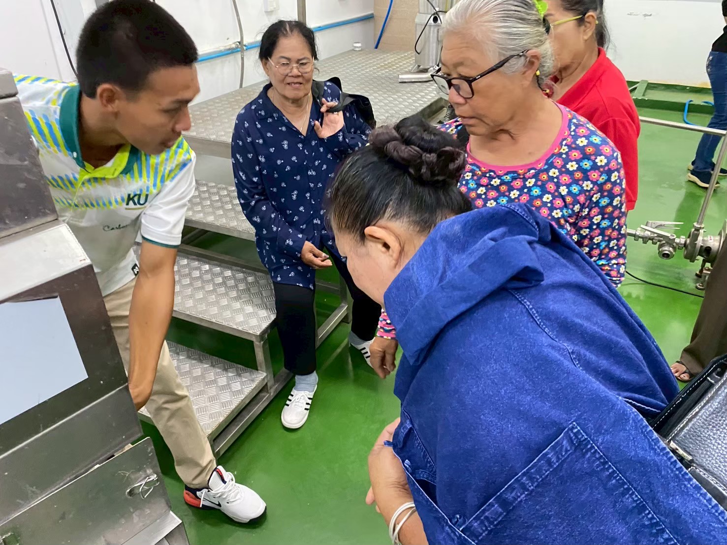 ผู้เข้าอบรมได้เข้าเยี่ยมชมโรงผลิตเครื่องดื่ม รับฟังการบรรยายและซักถามข้อสงสัยเกี่ยวกับการผลิตเครื่องดื่มน้ำนมข้าวโพดหวาน ตรา เคยู กำแพงแสน ซึ่งผู้เข้าอบรมสามารถนำความรู้ที่ได้ไปประยุกต์ใช้ในการออกแบบและพัฒนาสถานที่ผลิตของวิสาหกิจชุมชนฯ นอกจากนี้ยังได้เยี่ยมชมโรงเรือนปลูกผัก ศูนย์เทคโนโลยีการเกษตรครบวงจร (ATC) ที่อยู่ในบริเวณใกล้เคียงกับโรงผลิตเครื่องดื่ม และได้แลกเปลี่ยนความรู้ในการปลูกและดูแลพืชผักกับผู้ดูแลการผลิตพืชผักในโรงเรือน