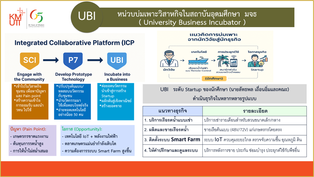 SCI – P7 – UBI ในเรื่องของการใช้ เทคโนโลยีเรือพลังงานไฟฟ้าในรูปแบบการควบคุมอัตโนมัติ สำหรับสวนมะพร้าวน้ำหอม ในอำเภอดำเนินสะดวก จังหวัดราชบุรี
