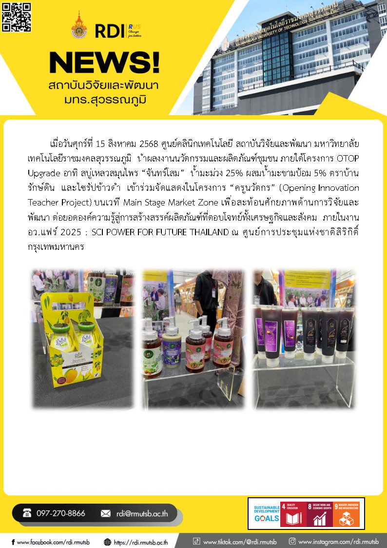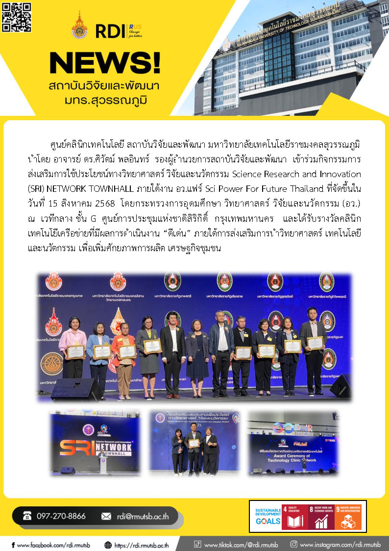 ระหว่างวันที่ 9 – 17 สิงหาคม 2568 ศูนย์คลินิกเทคโนโลยี สถาบันวิจัยและพัฒนา มหาวิทยาลัยเทคโนโลยีราชมงคลสุวรรณภูมิ ได้รับเกียรติบัตรผลการดำเนินงานดีเด่น จากการดำเนินงาน โครงการบริการคำปรึกษาและบริการข้อมูลด้านวิทยาศาสตร์และเทคโนโลยี (คลินิกเทคโนโลยี) ภายใต้การจัดกิจกรรม Science Research and Innovation (SRI) NETWORK TOWNHALL ณ เวทีกลาง ชั้น G ศูนย์การประชุมแห่งชาติสิริกิติ์ กรุงเทพมหานครพร้อมทั้งนำผลิตภัณฑ์ ข้าว กข 43และ POP Riceจากแพลตฟอร์มแพลตฟอร์มเพิ่มศักยภาพธุรกิจชุมชน (BCE)ร่วมจัดแสดงในโซนการจัดแสดงนิทรรศการเทคโนโลยีชุมชนผลิตภัณฑ์ เครื่องแกงคั่วกลิ้งตรากลมกลืน ร่วมจัดแสดงผลงานผลิตภัณฑ์ OTOP ที่ได้รับการพัฒนาภายใต้โครงการฯ เพื่อแสดงศักยภาพในการพัฒนาสินค้าด้วยวิทยาศาสตร์ เทคโนโลยีและนวัตกรรม พร้อมทั้งจัดนิทรรศการนำเสนอผลงาน/ผลิตภัณฑ์ ที่ร่วมพัฒนากับเครือข่าย จำนวน 3 ผลิตภัณฑ์ 1.สบู่เหลวสมุนไพร จันทร์โสม 2.น้ำมะม่วง 25%3.ไซรัปข้าวดำ จากโครงการคูปองวิทย์เพื่อโอทอป ในงานโครงการ การพัฒนาศักยภาพครู สกร. เพื่อเพิ่มขีดความสามารถของเครือข่ายในการนำงานด้าน ววน. พัฒนาพื้นที่ ภาคกลางและภาคตะวันออก รายงานโดย นางสาวชนาพร วัยทรง วันที่รายงาน 19/08/2568 [19733] |