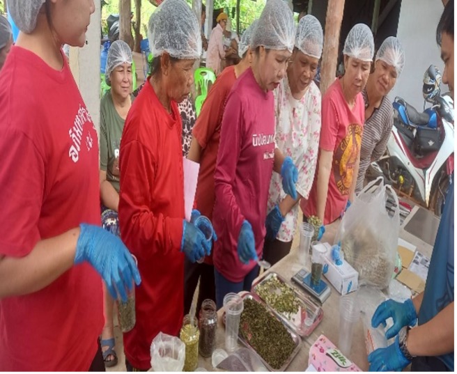 กิจกรรมที่ 4 ออกแบบผลิตภัณฑ์ชาข้าวเม่าและผลพลอยได้ผสมสมุนไพร ออกแบบและพัฒนาผลิตภัณฑ์ชาข้าวเม่า รำและข้าวลีบ ผสมพืชสมุนไพร เช่น ใบเตย กุหลาบ ดาวเรือง ไหมข้าวโพด ขิง บรรจุในซองชาเยื่อกระดาษ และชงเพื่อทดสอบชิม คัดเลือกตำรับที่เหมาะสม พัฒนาผลิตภัณฑ์ชาพืชสมุนไพร และชาข้าวเม่าผสมพืชสมุนไพรบรรเทาอาการเมาค้าง โดยใช้เทคโนโลยีที่เหมาะสมกับชุมชน คั่วในกระทะที่ใช้คั่วข้าวเม่า จนแห้งสนิทหรือมีค่า aw น้อยกว่า 0.6 เพื่อป้องกันเชื้อราและยืดอายุการเก็บรักษา และบรรจุในถุงชา อย่างไรก็ตาม ข้าวเม่าบ้านนาล้อมเริ่มผลิตในช่วงเดือนกรกฎาคม-พฤศจิกายน จึงมีการพัฒนาผลิตภัณฑ์ชาข้าวเม่าในช่วงเดือนกรกฎาคม ส่วนชาสมุนไพรได้มีการพัฒนาตั้งแต่เดือนมีนาคม-สิงหาคม ตามฤดูกาลเก็บเกี่ยวของพืชชนิดนั้นๆ ชาพืชสมุนไพร และชาข้าวเม่าผสมพืชสมุนไพรบรรเทาอาการเมาค้าง ตามตำรับของชุมชนพบว่ามีสมุนไพรหลายชนิดที่ไม่อยู่ในรายการพืชอาหารที่ใช้ทำเครื่องดื่มตามประกาศของกระทรวงสาธารณสุข จึงได้ศึกษาชนิดของพืชและส่วนของพืชตามประกาศกระทรวงสาธารณสุข คือ เนื้อผลมะขามป้อม เนื้อผลมะนาว กลีบเลี้ยงหรือริ้วประดับกระเจี๊ยบแดง เหง้าขิง ใบหรือยอดโหระพา ดอกคำฝอย ซึ่งส่วนใหญ่ไม่สามารถหาได้ในท้องถิ่น ดังนั้น จึงได้พัฒนาผลิตภัณฑ์ที่อยู่ในเกณฑ์และมีวัตถุดิบปริมาณมากในท้องถิ่น โดยพืชเหล่านี้ต้องมีประวัติการนำมาใช้เป็นอาหาร ไม่พบสารพิษธรรมชาติ หรือสารอื่นที่อาจมีอันตรายต่อสุขภาพ ตามที่ระบุในประกาศกระทรวงสาธารณสุข (ฉบับที่ 426) พ.ศ.2564 เท่านั้น จึงได้เลือกออกแบบและพัฒนาผลิตภัณฑ์ใหม่ คือ ชาข้าวเม่าหอมแดง ซึ่งประกอบไปด้วย ข้าวเม่า หอมแดง ใบเตย และใบหม่อน อย่างไรก็ตาม อาจารย์ได้ลงพื้นที่เพื่อนำสูตรผลิตภัณฑ์ต้นแบบไปทดสอบชิมให้กับสมาชิกของวิสาหกิจชุมชนฯ รวมทั้งให้ชุมชนทดลองพัฒนาสูตรผลิตภัณฑ์ต้นแบบ โดยใช้พืชที่ปลูกในท้องถิ่น กิจกรรมที่ 5 อบรมถ่ายทอดเทคโนโลยีการทำอาหารแห้งด้วยตู้อบชีวมวล ทีมอาจารย์ได้ปรึกษากับสมาชิกวิสาหกิจชุมชนฯ เพื่อร่วมกันออกแบบเตาชีวมวล ให้มีประสิทธิภาพดีกว่าเตาคั่วข้าวเม่าแบบเดิม และร่วมกันออกแบบตู้อบพลังงานชีวมวลเพื่อใช้ประโยชน์จากฟืน ถ่านที่เหลือจากการคั่วข้าวเม่า รวมทั้งเศษชีวมวลต่างๆ เช่น ตอซังข้าว เพื่อใช้ในการอบแห้งชาหรือผลิตภัณฑ์อาหารแห้งต่างๆ เมื่อออกแบบและจัดทำเตาพลังงานชีวมวลแล้ว นำไปอบรมถ่ายทอดเทคโนโลยีการทำแห้งข้าวเม่าในวันที่ 29 สิงหาคม พ.ศ. 2568 ให้กับสมาชิกวิสาหกิจชุมชน ณ วิสาหกิจชุมชนกลุ