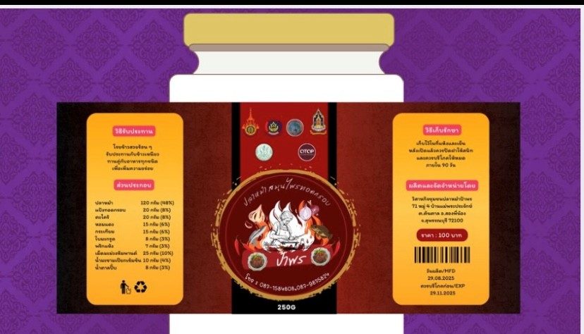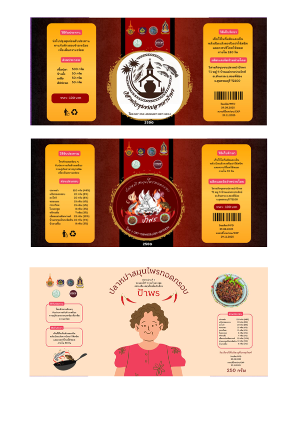 กิจกรรมที่ 6 การพัฒนาออกแบบตราวิสาหกิจชุมชนปลาหมำป้าพร ตราสินค้า และบรรจุภัณฑ์ สำหรับผลิตภัณฑ์ปลาหมำและปลาหมำสมุนไพรทอดกรอบ เมื่อระหว่างวันที่ 8-12 กันยายน 2568 อาจารย์พรทิพย์ ช่วยเพล หัวหน้าโครงการ พร้อมด้วยทีมคณะทำงาน ดำเนินกิจกรรมพัฒนาและออกแบบตราสัญลักษณ์ของวิสาหกิจชุมชน (Community Enterprise Logo) ตราสินค้า (Brand Logo) และบรรจุภัณฑ์สำหรับผลิตภัณฑ์หลัก ได้แก่ ปลาหมำและปลาหมำสมุนไพรทอดกรอบ กิจกรรมนี้มีวัตถุประสงค์เพื่อยกระดับภาพลักษณ์ผลิตภัณฑ์ท้องถิ่นให้มีความโดดเด่น ทันสมัย และเป็นที่จดจำของผู้บริโภค ตลอดจนเพิ่มมูลค่าและศักยภาพในการแข่งขันทางการตลาด โดยเนื้อหากิจกรรมประกอบด้วย