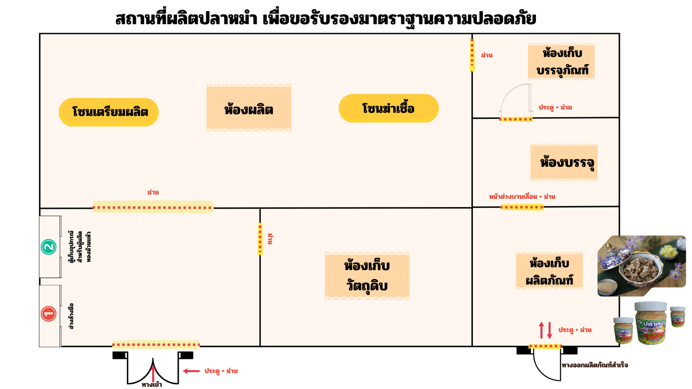 กิจกรรมที่ 8 การออกแบบและปรับปรุงสถานที่ผลิต เพื่อยกระดับมาตรฐานการผลิตและเตรียมความพร้อมสู่การขอรับรอง อย. เมื่อระหว่างวันที่ 20-26 กันยายน 2568 อาจารย์พรทิพย์ ช่วยเพล หัวหน้าโครงการ พร้อมด้วยทีมคณะทำงาน ได้ดำเนินงานออกแบบและปรับปรุงสถานที่ผลิตให้เป็นไปตามหลักสุขาภิบาลอาหารและข้อกำหนดด้านมาตรฐานความปลอดภัยอาหาร (Food Safety) เพื่อเตรียมความพร้อมเข้าสู่กระบวนการยื่นขอรับรองมาตรฐานจากสำนักงานคณะกรรมการอาหารและยา (อย.) โดยวัตถุประสงค์ของกิจกรรมคือ เพื่อปรับโครงสร้างและการจัดวางผังสถานที่ผลิต (Plant Layout) ให้สอดคล้องตามหลัก GMP (Good Manufacturing Practice) และข้อกำหนดของ อย. เพื่อให้กระบวนการผลิตปลาหมำและผลิตภัณฑ์แปรรูปมีความสะอาด ปลอดภัย และควบคุมคุณภาพได้ง่ายขึ้น ซึ่งสาระสำคัญของกิจกรรม ประกอบด้วย ดังนี้