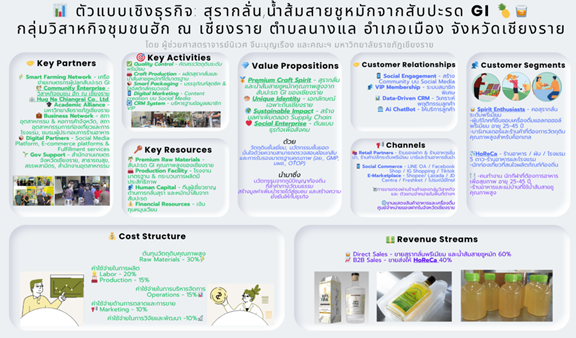 จากการดำเนินกิจกรรมอบรมเชิงปฏิบัติการความรู้ด้านโมเดลธุรกิจและการพัฒนาแผนธุรกิจ พบว่าผู้เข้าร่วมมีความเข้าใจและสามารถประยุกต์ใช้เครื่องมือ BMC ในการวางแผนธุรกิจได้อย่างเป็นรูปธรรม ด้านความรู้และความเข้าใจผู้เข้าร่วมทั้ง 12 คน สามารถอธิบายองค์ประกอบทั้ง 9 ของ BMC และเข้าใจความสัมพันธ์ระหว่างองค์ประกอบต่างๆ ได้เป็นอย่างดี ด้านการปฏิบัติผู้เข้าร่วมสามารถจัดทำ BMC สำหรับธุรกิจสุรากลั่นสับปะรดได้อย่างสมบูรณ์ โดยมีการระบุกลุ่มลูกค้าเป้าหมาย 3 กลุ่มหลัก ได้แก่ นักท่องเที่ยว ร้านอาหาร และผู้บริโภคทั่วไป พร้อมกำหนดคุณค่าที่ส่งมอบ (Value Propositions) ที่ชัดเจน คือ "สุรากลั่นสับปะรด GI จังหวัดเชียงราย ผลิตจากวัตถุดิบคุณภาพ มีเอกลักษณ์เฉพาะถิ่น" ด้านการพัฒนาแผนธุรกิจกลุ่มวิสาหกิจชุมชนสามารถจัดทำแผนธุรกิจระยะ 1 ปี ที่ประกอบด้วยแผนการตลาด แผนการผลิต และแผนการเงิน โดยตั้งเป้าหมายยอดขายปีแรกและมีแผนการขยายตลาดในปีที่ 2-3 ผลสำเร็จ กลุ่มวิสาหกิจชุมชนมีความเข้าใจในโมเดลธุรกิจและสามารถนำไปปรับใช้กับการวางแผนธุรกิจได้ กลุ่มวิสาหกิจชุมชนมีแผนธุรกิจที่ชัดเจนและเป็นระบบ สามารถใช้เป็นแนวทางในการดำเนินธุรกิจและขอสนับสนุนจากหน่วยงานต่างๆ ได้