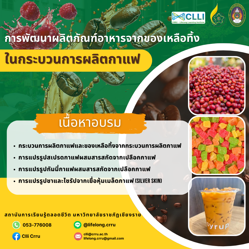 การพัฒนาผลิตภัณฑ์อาหารจากของเหลือทิ้งในกระบวนการผลิตกาแฟ เป็นหลักสูตรที่เน้นการแปรรูปเพิ่มมูลค่าของเหลือทิ้งจากกระบวนการผลิตกาแฟ โดยอธิบายถึงการได้มาถึง ของเหลือทิ้งจากกระบวนการต่างๆ และนำของเหลือทิ้งนั้นมาประเมินศักยภาพเพื่อนำมาพัฒนาเป็นผลิตภัณฑ์ อาหารใหม่ที่สามารถสร้างรายได้และเป็นการลดของเสียจากกระบวนการผลิตกาแฟ ซึ่งจัดอาหาร Upcycled Food ที่กำลังเป็นกระแสในปัจจุบัน