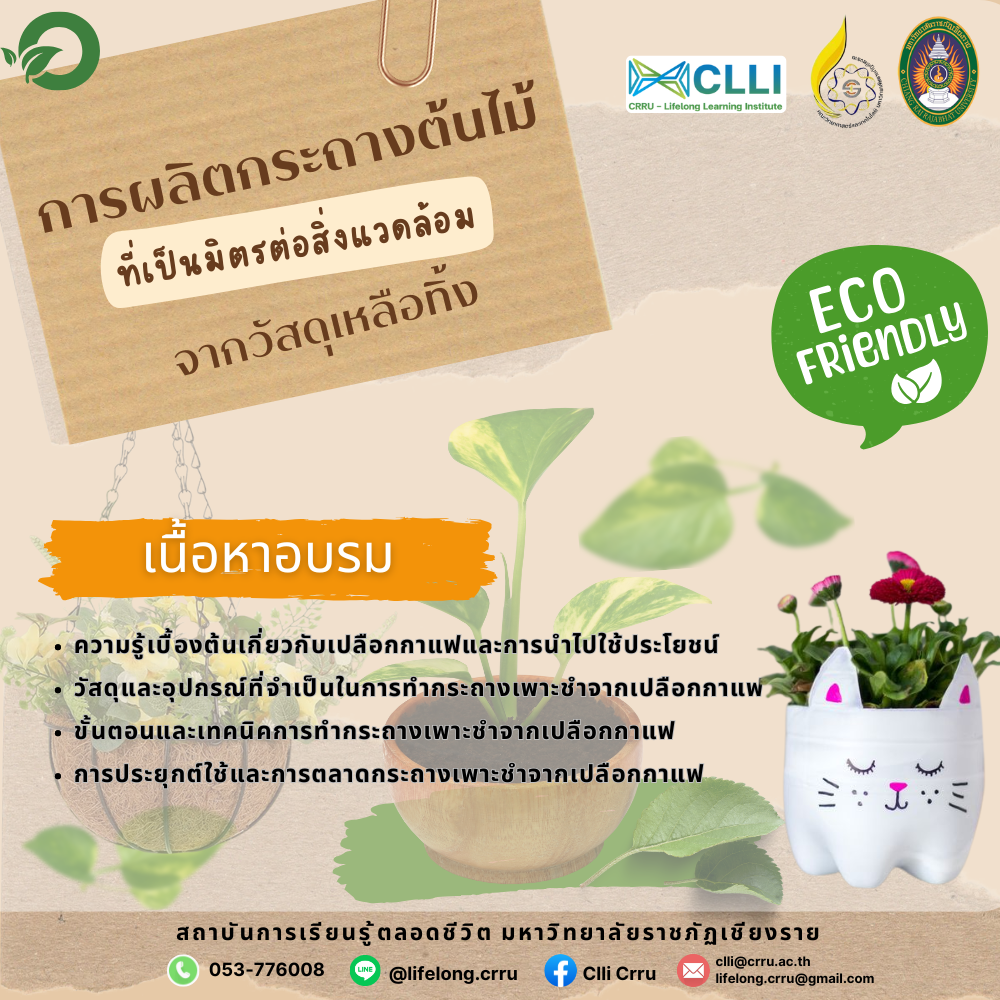 การผลิตกระถางต้นไม้ที่เป็นมิตรต่อสิ่งแวดล้อมจากวัสดุเหลือทิ้งหลักสูตรนี้มุ่งเน้นการสร้างกระถางเพาะชำจากเปลือกกาแฟ ซึ่งเป็นวัสดุเหลือใช้ทางการเกษตรเพื่อเพิ่มมูลค่าและลดขยะ ผู้เข้าร่วมจะได้เรียนรู้ตั้งแต่คุณสมบัติของเปลือกกาแฟ การเตรียมวัสดุ ไปจนถึงการขึ้นรูปกระถางด้วยเทคนิคที่หลากหลาย กระถางที่ได้จะสามารถย่อยสลายได้เองตามธรรมชาติ เป็นมิตรต่อสิ่งแวดล้อม และเป็นทางเลือกที่ดีสำหรับการเพาะปลูกต้นกล้า หลักสูตรนี้เหมาะสำหรับผู้ที่สนใจการนำวัสดุเหลือใช้มาสร้างสรรค์ผลิตภัณฑ์ที่เป็นมิตรต่อสิ่งแวดล้อมเพื่อการเกษตรยั่งยืน