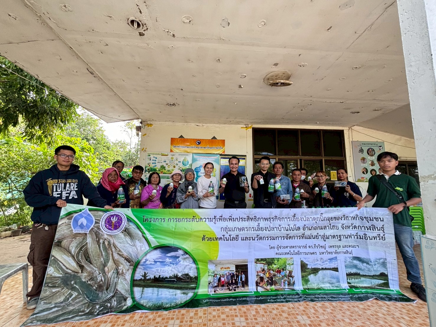 วันที่ ๒๙ พฤศจิกายน ๒๕๖๘ ผู้ช่วยศาสตราจารย์ ดร.กีรวิชญ์ เพชรจุล ดร.ประสิทธิ์ ขุนสนิท ว่าที่ร้อยตรี ดร.ธนภูมิ  บุญมี นางสาวอาภากร  อันพิมพ์ และมีนักศึกษาลงพื้นที่เรียนรู้ในชุมชน จำนวน ๒ ราย ได้แก่ นายสรวิชญ์  ฉิมพาลี  นายธรรมศักดิ์  บริบูรณ์ เป็นนักศึกษาระดับปริญญาตรี ชั้นปีที่ ๓ หลักสูตรวิทยาศาสตรบัณฑิต สาขาวิชาเกษตรอัจฉริยะ ลงพื้นที่ ณ กลุ่มวิสาหกิจชุมชนผู้เลี้ยงปลาดุกบิ๊กอุยบ้านโปโล ตำบลกมลาไสย อำเภอกมลาไสย จังหวัดกาฬสินธุ์ จัดโครงการถ่ายทอดเทคโนโลยี หลักสูตรที่ ๓ การใช้สารเสริมโปรไบโอติกเพื่อเพิ่มประสิทธิภาพการเลี้ยงปลาดุกบิ๊กอุย (ภาคปฏิบัติการในสนาม) โดยได้มีการปฏิบัติการเกี่ยวกับการเพาะเลี้ยงจุลินทรีย์โปรไบโอติก มีการเตรียมอุปกรณ์การเพาะเลี้ยง อาหารเลี้ยงจุลินทรีย์โปรไบโอติก และการให้อากาศ เพื่อเพิ่มออกซิเจนให้กับจุลินทรีย์โปรไบโอติก  มีการแจกปัจจัยการผลิต ได้แก่ อุปกรณ์ที่เกี่ยวข้องการการเพาะเลี้ยงจุลินทรีย์โปรไบโอติก อาหาร และจุลินทรีย์โปรไบโอติก ให้กับเกษตรกรเพื่อนำไปใช้ในฟาร์มเลี้ยงปลาดุกบิ๊กอุยได้จริง ในภาคปฏิบัติการมีการสาธิตกรรมวิธีในการเพาะเลี้ยงจุลินทรีย์โปรไบโอติกเพื่อให้มีการใช้อย่างต่อเนื่องภายในฟาร์ม หลังจากการถ่ายทอดความรู้และการสาธิต ได้มีการลงพื้นที่เพื่อติดตามผลการใช้จุลินทรีย์โปรไบโอติกในพื้นที่เกษตรกรเป้าหมายอย่างต่อเนื่อง มีการเก็บข้อมูลเกี่ยวกับคุณภาพน้ำ สภาพแวดล้อม น้ำทิ้งจากบ่อเลี้ยง อัตราการเจริญเติบโตของปลาดุกบิ๊กอุย รวมถึงอัตราการรอดตาย พร้อมทั้งได้ห้คำแนะนำเชิงเทคนิคเพิ่มเติมแก่เกษตรกรอย่างต่อเนื่อง