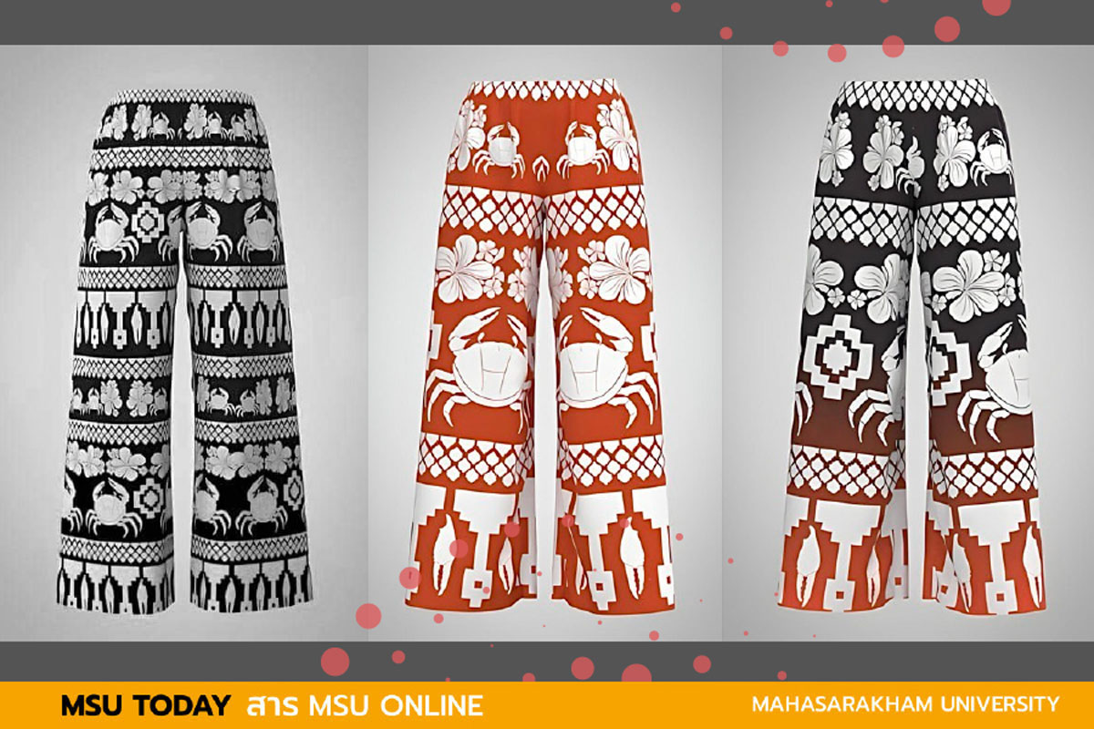 กางเกงประจำจังหวัดมหาสารคามขึ้น ผมเลยลองออกแบบขึ้นมา ซึ่งลายก็เกิดจากการ รวมอัตลักษณ์ของจังหวัดเราเอาไว้ ได้แก่ สัตว์ประจำจังหวัด ปูแป้ง ดอกไม้ประจำจังหวัด ดอกลีลาวดี และ ลายผ้าไหมประจำจังหวัด ลายสร้อยดอกหมากครับ และสุดท้ายสีของกางเกงที่เป็น อมเบร จากสีดำไปส้มแดง คือสีที่ได้แรงบันดาลใจมาจากสีของก้ามปูทูลกระหม่อม