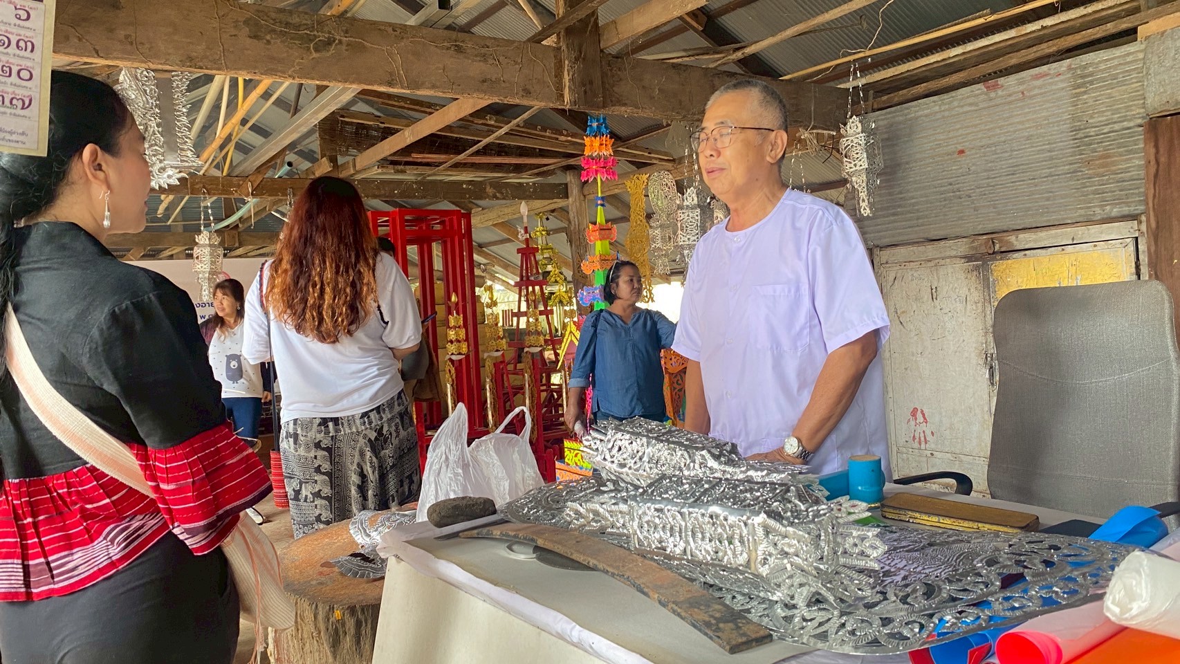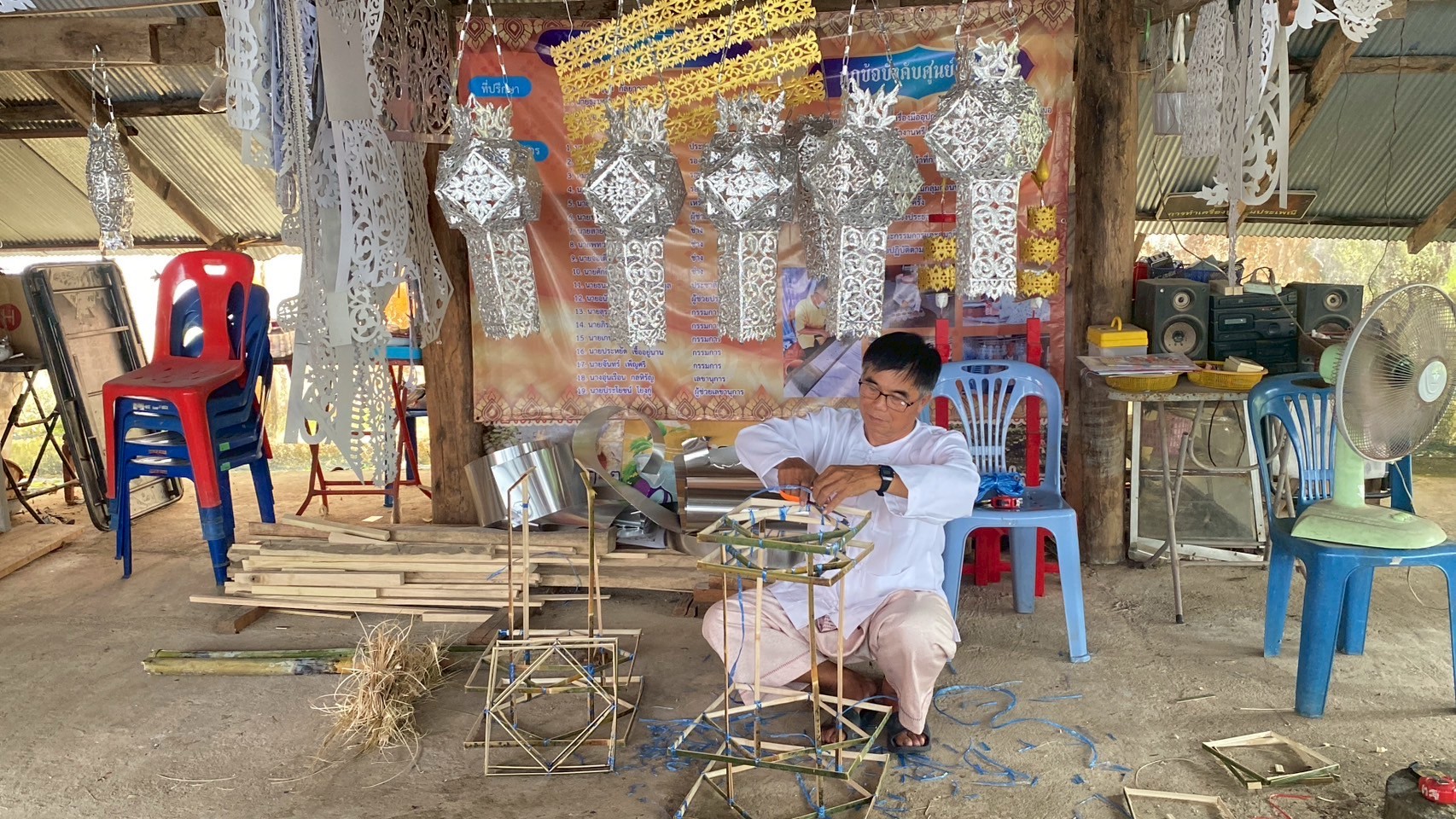 ฐานที่ 1 การต้องลาย(ฉลุ) ทำจองพารา(ปราสาทราชวัตร) ทำตำข่อน(ตุงไทใหญ่) และการทำโคมไฟ โดย นายณัฐพล สุวรรณสังข์ เป็นผู้จัดการฐาน ตั้งอยู่วัดต่อแพ