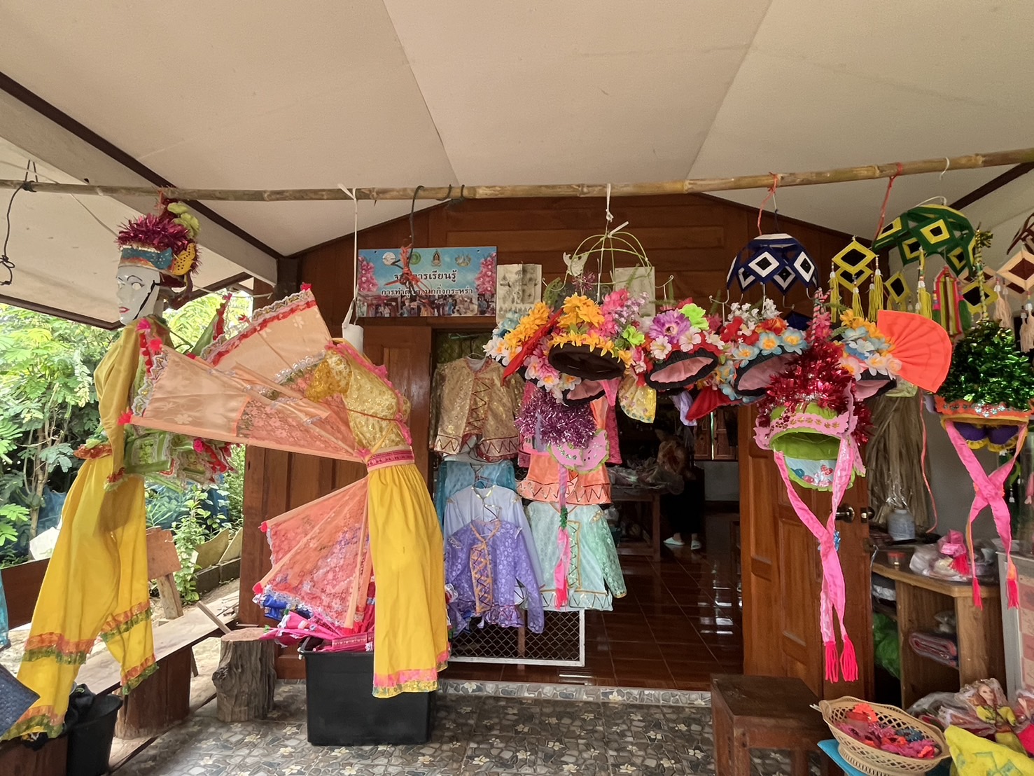 ฐานที่ 4 การทำตุ๊กตานกกิ่งกะหร่า ตัวนก ตัวโต ฯลฯ. ตั้งอยู่บ้าน ป้ามุ้งหรือนางจันทร์นิภา ทองคำ หมวกส่างลอง (ชฎา) ป้ามุ้ง เป็นผู้จัดการบ้านอยู่ตรงข้าม