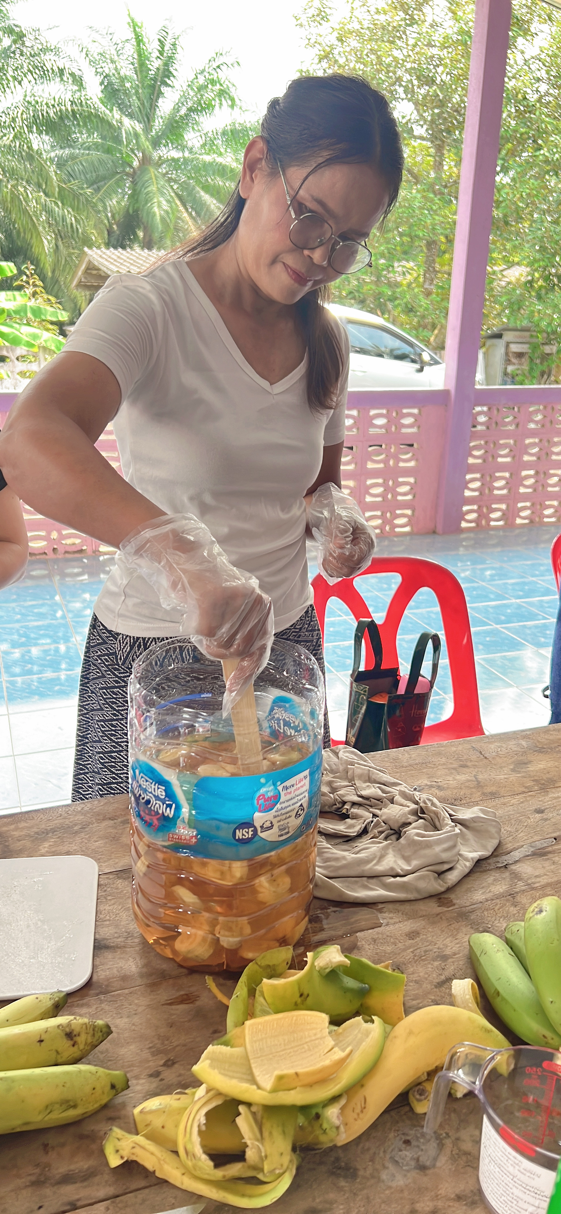 รายงานผลการปฏิบัติการ วันที่ 1 สิงหาคม 2568 โครงการกล้วยหอมทองไซเดอร์ อำเภอละแม จังหวัดชุมพร ผศ.ดร.มัลลิกา จินดาซิงห์ และคณะได้ลงพื้นที่หมู่บ้านกล้วยหอมทองไซเดอร์ เพื่อดำเนินการประชุมกับประธานกลุ่ม นางชัชญา โอ๋พั่ง และสมาชิกกลุ่มเพื่อสร้างความเข้าใจเกี่ยวกับกระบวนการและขั้นตอนกระบวนการดำเนินโครงการ การสร้างหมู่บ้านกล้วยหอมทองละแมครบวงจร เพื่อใช้ประโยชน์จากต้นกล้วยหอมทองครบทุกส่วน เพื่อมุ่งสู่ Zero waste และวัตถุประสงค์ในการดำเนินโครงการเพื่อถ่ายทอดองค์ความรู้ทางด้านวิทยาศาสตร์และเทคโนโลยีให้เป็นหมู่บ้านกล้วยหอมละแมครบวงจร เพื่อใช้ประโยชน์จากต้นกล้วยหอมทองครบทุกส่วน เพื่อมุ่งสู่ Zero wast การส่งเสริมและพัฒนาการแปรรูปผลิตภัณฑ์พื้นถิ่นกล้วยหอมทอง ด้วยการประยุกต์ใช้ภูมิปัญญานวัตกรรมและเทคโนโลยีอย่างปลอดภัย และการสร้างอัตลักษณ์หรือนำเสนอเรื่องราวเกี่ยวกับแหล่งกำเนิดให้กับสินค้า สร้างความแตกต่างและความ โดดเด่นของสินค้า รวมถึงการสร้างตราสินค้า ฉลาก และบรรจุภัณฑ์