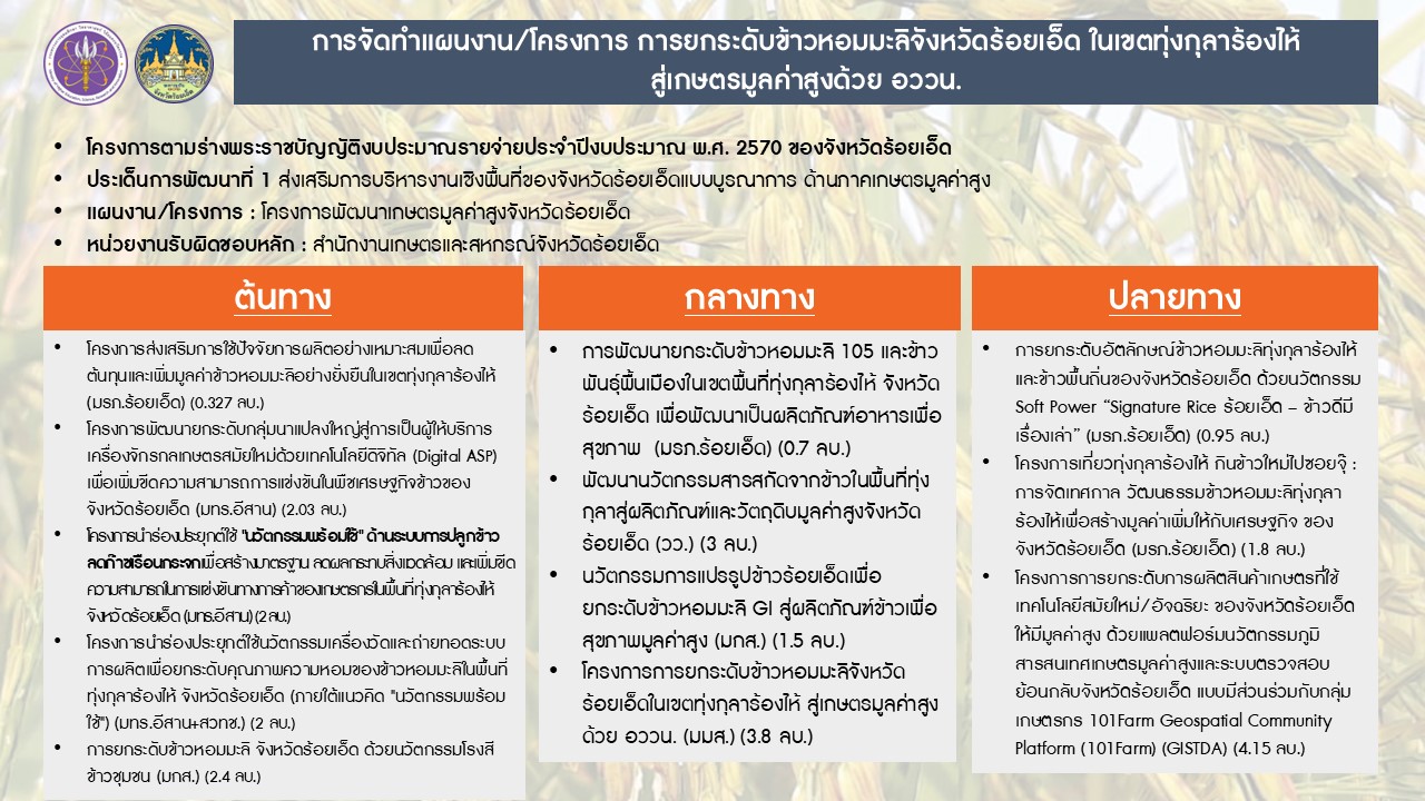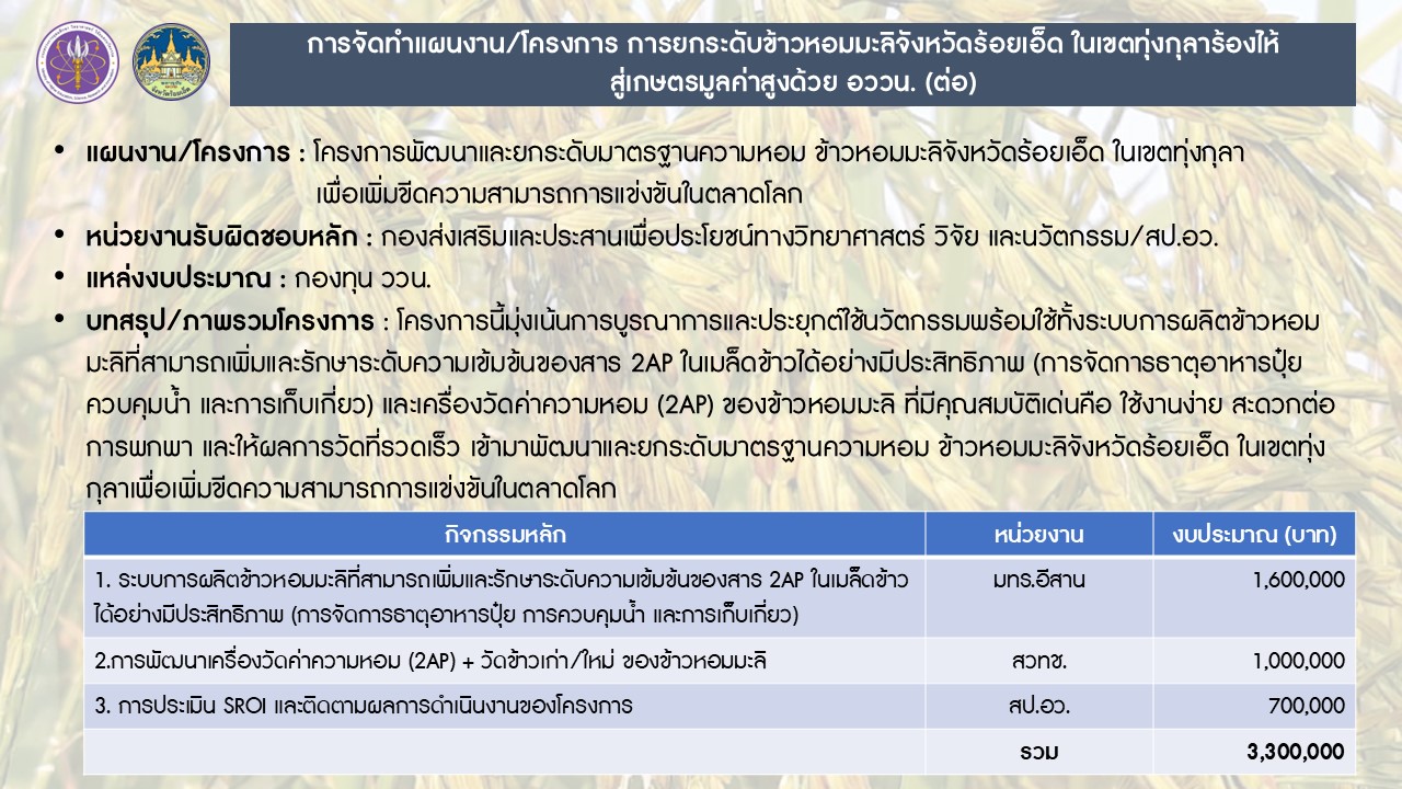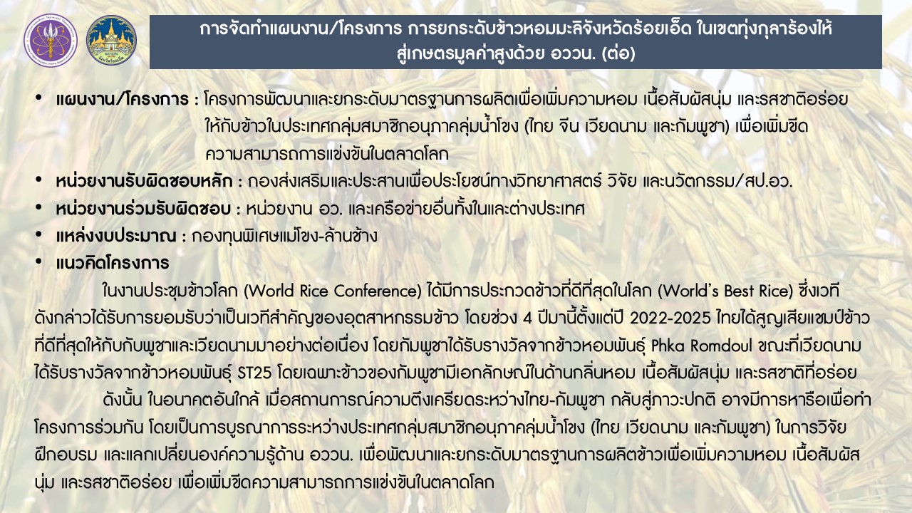 และ นายเอกพงศ์ฯ ยังได้นำเสนอแผนงาน/โครงการ ภายใต้ MOU การยกระดับข้าวหอมมะลิจังหวัดร้อยเอ็ด ในเขตทุ่งกุลาร้องไห้ สู่เกษตรมูลค่าสูงด้วย อววน. (พ.ศ. 2568 – 2572) ซึ่งประกอบด้วย 2 ส่วน ได้แก่