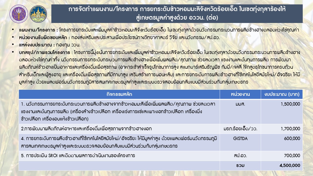 - โครงการยกระดับและเพิ่มมูลค่าข้าวหอมมะลิจังหวัดร้อยเอ็ด ในเขตทุ่งกุลาด้วยนวัตกรรมกระบวนการผลิตข้างฮางตลอดห่วงโซ่คุณค่า