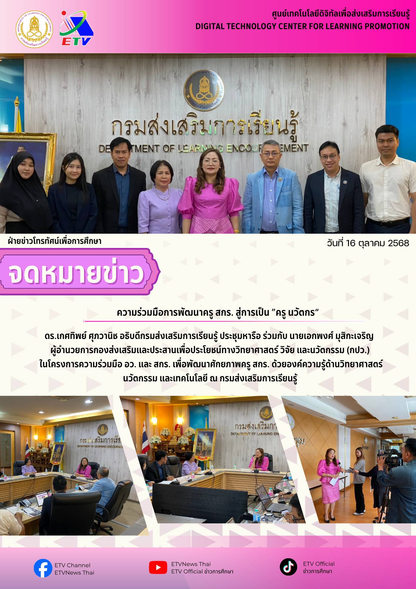 ตามที่อธิบดี สกร.เป็นประธานการประชุมหารือกับผู้แทน สป.อว.(นายเอกพงษ์ มุสิกะเจริญ ผอ.กองส่งเสริมและประสานเพื่อประโยชน์ทางวิทยาศาสตร์ วิจัยและนวัตกรรม (กปว.) และคณะ พร้อมด้วย นางยุพิน บัวคอม รองอธิบดี สกร.และคณะทำงานกองส่งเสริมและพัฒนานวัตกรรมการเรียนรู้ เรื่อง “ความร่วมมือพัฒนาครู สกร. ด้วยวิทยาศาสตร์ เทคโนโลยี และนวัตกรรม (ววน.)” ในวันที่ 16 ตุลาคม 2568 ณ ห้องประชุมบรรจง ชูสกุลชาติ สกร. นั้น กองส่งเสริมและพัฒนานวัตกรรมการเรียนรู้ ขอรายงานสรุปสาระสำคัญ ดังนี้