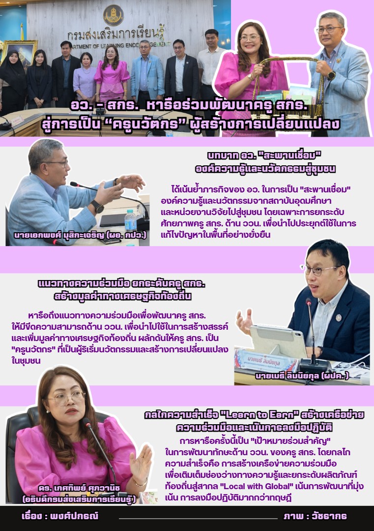 📚📌ด้าน นายเมธี ลิมนิยกุล (ผปค.) ได้หารือถึงแนวทางความร่วมมือกับ สกร. ในการพัฒนาบุคลากร โดยมีเป้าหมายให้ครู สกร. มีขีดความสามารถด้าน ววน. และสามารถนำความรู้ไปใช้แก้ปัญหาเฉพาะพื้นที่ เพื่อสร้างสรรค์และเพิ่มมูลค่าทางเศรษฐกิจท้องถิ่น การเสริมสร้างทักษะเหล่านี้จะผลักดันให้ครู สกร. กลายเป็น “ครูนวัตกร” (Innovator) ที่ไม่เพียงแต่ถ่ายทอดความรู้ แต่ยังเป็นผู้ริเริ่มนวัตกรรมและสร้างการเปลี่ยนแปลงในชุมชน