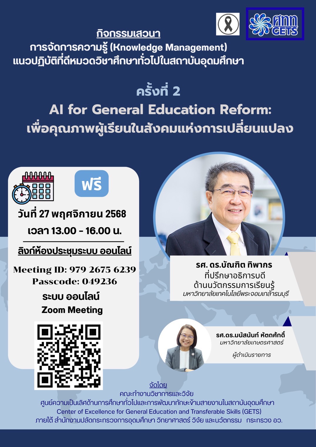 ศูนย์ความเป็นเลิศด้านการศึกษาทั่วไปและการพัฒนาทักษะข้ามสายงานในสถาบันอุดมศึกษา (GETS) ขอเชิญคณาจารย์ ผู้บริหารและผู้สนใจ เข้าร่วมโครงการฝึกอบรม เรื่อง การจัดการความรู้ (Knowledge Management) แนวปฏิบัติที่ดีหมวดวิชาศึกษาทั่วไปในสถาบันอุดมศึกษา ครั้งที่ 2