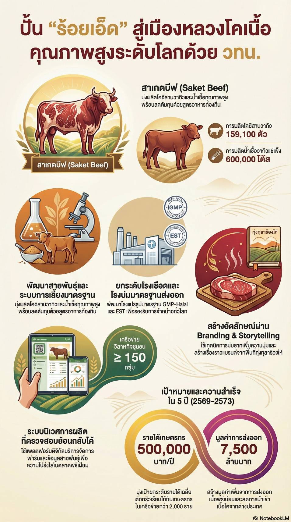 โดยในส่วนแผนการดำเนินงานพัฒนาโคเนื้อสาเกตบีฟในอนาคต ผศ.ดร.พันทิพย์ ปิยะทัศนานนท์ (มทส.) ได้กล่าวถึงโครงการยกระดับและสร้างมูลค่าเพิ่มโควากิวพรีเมี่ยม ของมหาวิทยาลัยเทคโนโลยีสุรนารี โดยโครงการมีเป้าหมาย ยกระดับการผลิตเนื้อโคอีสานวากิวคุณภาพสูงให้ได้มาตรฐานระดับสากล ภายในระยะเวลา 5 ปี ครอบคลุมลุม 7 แผนงานหลัก ตั้งแต่การเพิ่มปริมริาณโคต้นน้ำ การพัฒนาโควากิวฟูลบลัด การผลิตน้ำเชื้อวากิว การวิจัวิยสูตรอาหารต้นทุนต่ำ การพัฒนาเครือข่ายฟาร์มขุน โรงชำแหละที่ได้มาตรฐานส่งออก และการถ่ายทอดองค์ความรู้ให้เกษตรกรและผู้ประกอบการ เพื่อให้เกิดระบบนิเวศการผลิตที่โปร่งใส ตรวจสอบย้อนกลับได้ และตอบโจทย์ตลาดพรีเมี่ยมในประเทศและต่างประเทศ ผลผลิตที่คาดว่าจะเกิดขึ้นได้แก่ การผลิตโคอีสานวากิว 159,100 ตัว และโควากิวฟูลบลัด 900 ตัว การผลิตน้ำเชื้อวากิวแช่แข็ง 600,000 โด๊ส เพื่อรองรับการขยายพันธุ์ การยกระดับเครือรืข่าย ≥ 150 วิสาหกิจชุมชน และเกษตรกร ≥ 2,000 คน โรงแปรรูปเนื้อวากิวมาตรฐาน GMP-Halal พร้อมการขอรับรองมาตรฐานส่งออก (EST) ผลประโยชน์เชิงเศรษฐกิจที่คาดหวังภายใน 5 ปี ได้แก่ ลดการนำเข้าเนื้อโคพรีเรีมี่ยม ≥ 1,000 ล้านบาท มูลค่าการส่งออกเนื้ออีสานวากิว ≥ 7,500 ล้านบาท สร้างรายได้เฉลี่ยให้เกษตรกร ≥ 500,000 บาท/ครัวเรือน/ปี