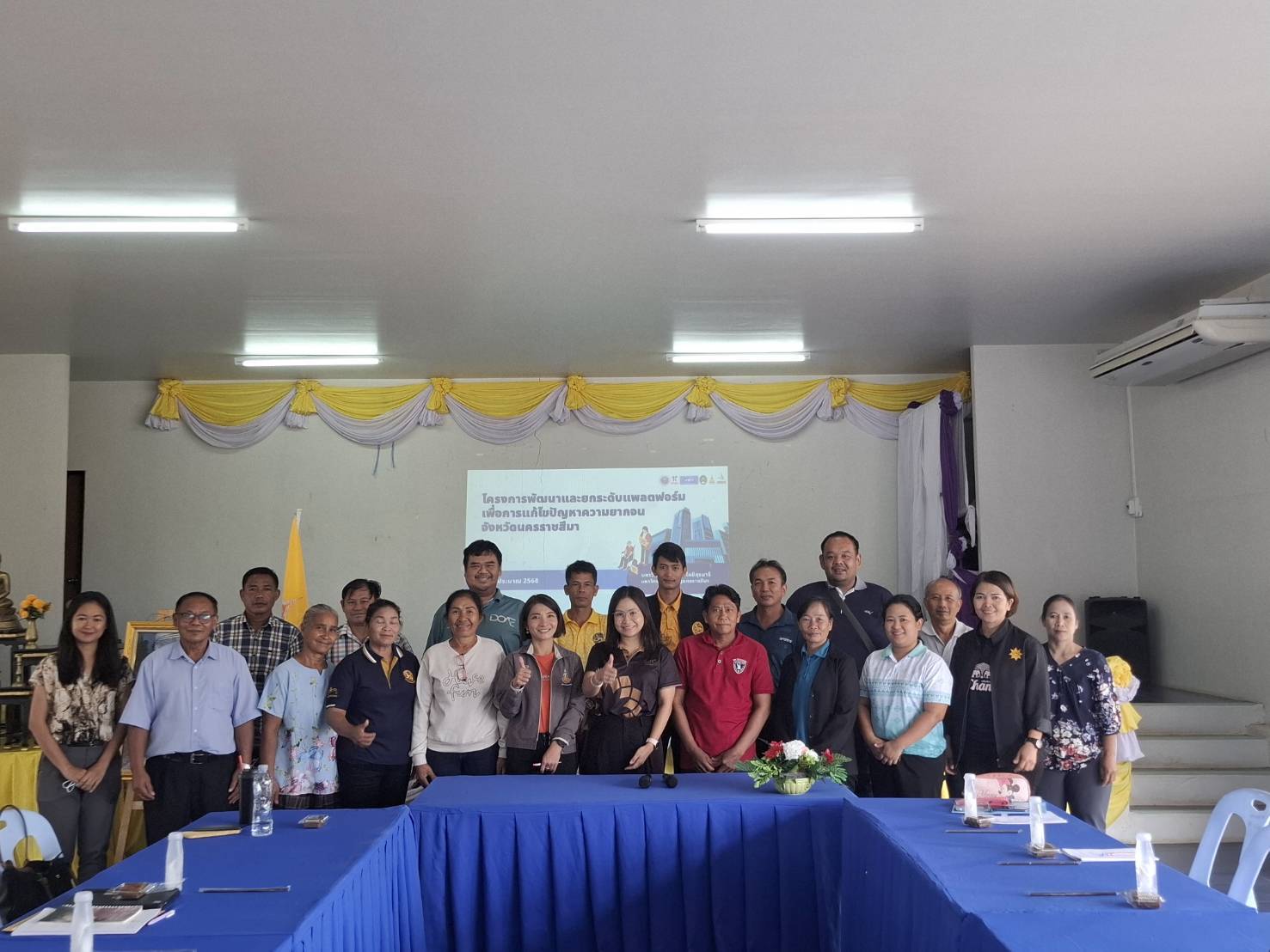 คลินิกเทคโนโลยี มหาวิทยาลัยเทคโนโลยีสุรนารี นำโดย อาจารย์ ดร.ศิริลักษณ์ ชุมเขียว ผู้ช่วยผู้อำนวยการเทคโนธานี ฝ่ายบริการวิชาการและพันธกิจสัมพันธ์กับสังคม พร้อมด้วยเจ้าหน้าที่ จัดประชุมสำรวจข้อมูลครัวเรือนยากจน เพื่อพัฒนาโมเดลแก้จนอย่างยั่งยืน ณ สำนักงานเทศบาลตำบลบ่อปลาทอง อำเภอปักธงชัย จังหวัดนครราชสีมา โดยมี นายทิพย์ ดีพรมราช นายกเทศมนตรีตำบลบ่อปลาทอง ให้เกียรติกล่าวต้อนรับ