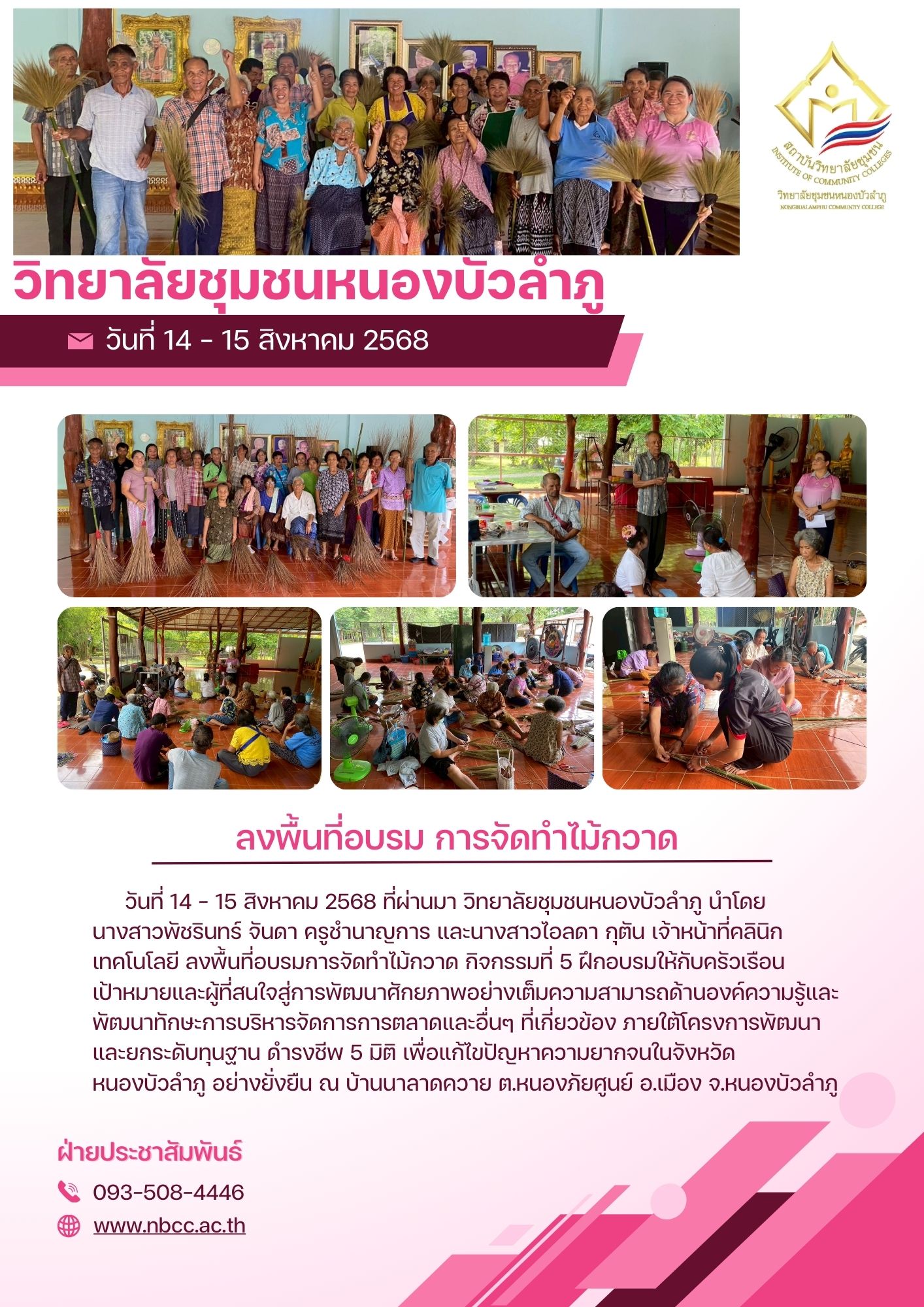 วันที่ 4 - 5 สิงหาคม 2568 ที่ผ่านมา วิทยาลัยชุมชนหนองบัวลำภู โดย นายกวินท์ คำปาละ นักวิชาการศึกษา ลงพื้นที่อบรมการจัดทำไม้กวาด กิจกรรมที่ 5 ฝึกอบรมให้กับครัวเรือน เป้าหมายและผู้ที่สนใจสู่การพัฒนาศักยภาพอย่างเต็มความสามารถด้านองค์ความรู้และพัฒนาทักษะการบริหารจัดการการตลาดและอื่นๆ ที่เกี่ยวข้อง ภายใต้โครงการพัฒนาและยกระดับทุนฐาน ดำรงชีพ 5 มิติ เพื่อแก้ไขปัญหาความยากจนในจังหวัดหนองบัวลำภู อย่างยั่งยืน ณ บ้านใหม่โพธิ์ทอง บ้านโคกกลาง บ้านบุ่งบก ต.ป่าไม้งาม อ.เมือง จ.หนองบัวลำภู รายงานโดย นางสาวไอลดา กุตัน วันที่รายงาน 18/09/2568 [19997] |