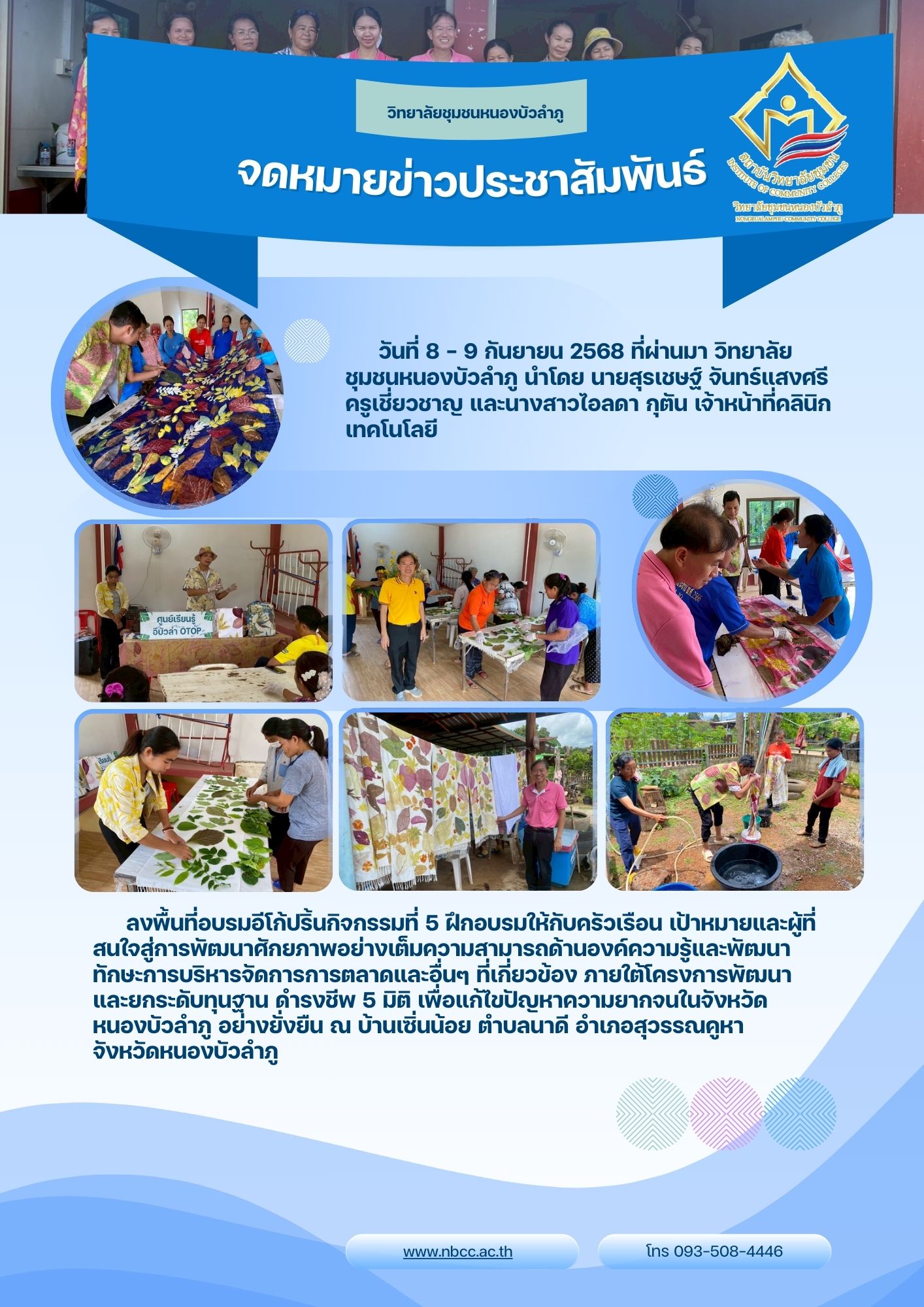 วันที่ 25 - 26 สิงหาคม 2568 ที่ผ่านมา วิทยาลัยชุมชนหนองบัวลำภู นำโดย นางปราณี สถิตบรรจง รองผู้อำนวยการวิทยาลัยชุมชนหนองบัวลำภู และนางสาววีระวรรณภรณ์ จำรองเพ็ง เจ้าหน้าที่งานกิจกรรมและโครงการพิเศษ ลงพื้นที่อบรมการจัดทำผ้าอีโค่ปริ้นท์ กิจกรรมที่ 5 ฝึกอบรมให้กับครัวเรือน เป้าหมายและผู้ที่สนใจสู่การพัฒนาศักยภาพอย่างเต็มความสามารถด้านองค์ความรู้และพัฒนาทักษะ การบริหารจัดการการตลาดและอื่นๆ ที่เกี่ยวข้อง ภายใต้โครงการพัฒนาและยกระดับทุนฐาน ดำรงชีพ 5 มิติ เพื่อแก้ไขปัญหาความยากจนในจังหวัดหนองบัวลำภู อย่างยั่งยืน ณ บ้านโนนสมบูรณ์/บ้านคูหาพัฒนา ต.นาสี อ.สุวรรณคูหา จ.หนองบัวลำภู รายงานโดย นางสาวไอลดา กุตัน วันที่รายงาน 18/09/2568 [20001] |