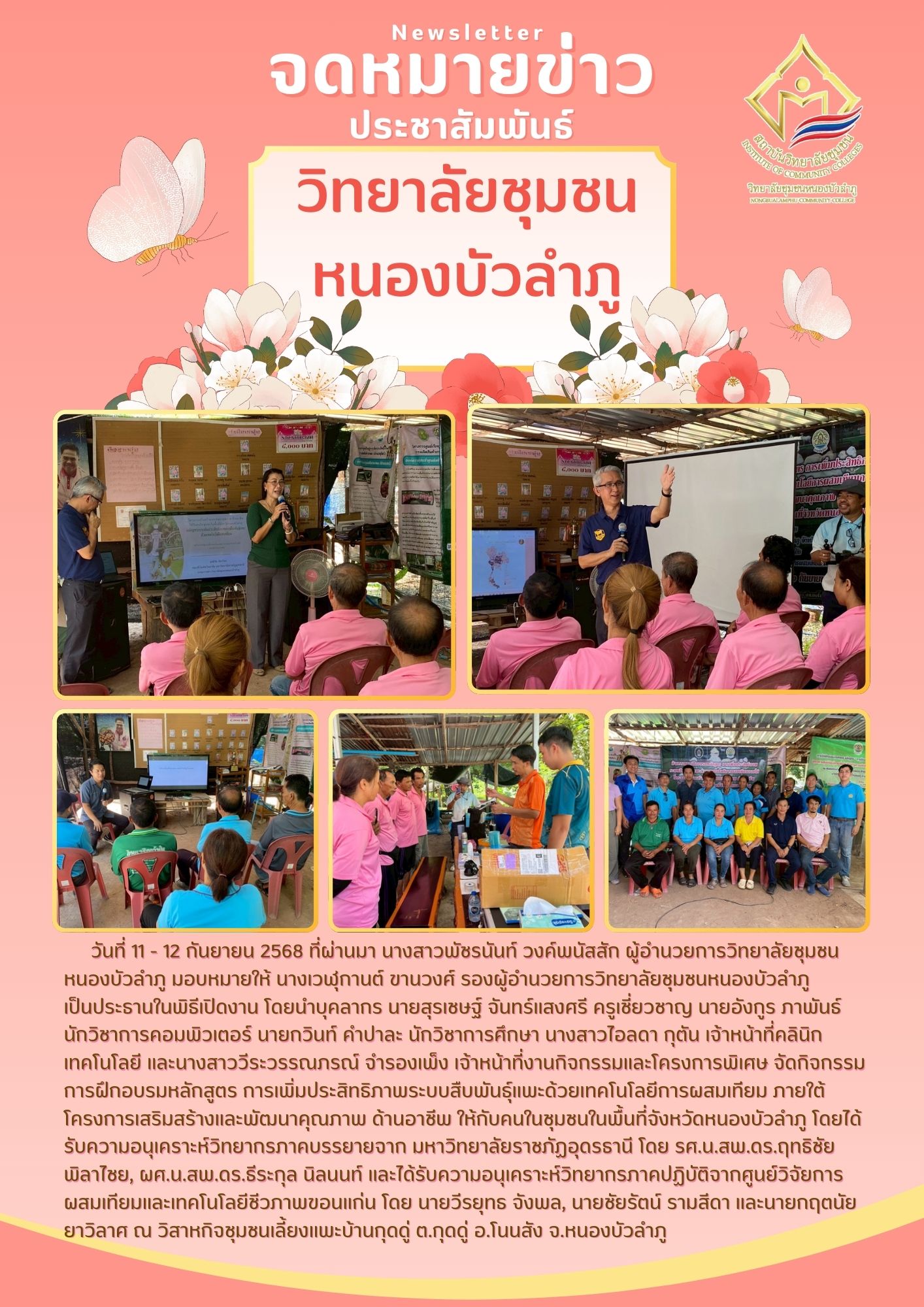 วันที่ 7 - 8 สิงหาคม 2568 ที่ผ่านมา วิทยาลัยชุมชนหนองบัวลำภู นำโดย นางปราณี สถิตบรรจง รองผู้อำนวยการวิทยาลัยชุมชนหนองบัวลำภู นายสุรเชษฐ์ จันทร์แสงศรี ครูเชี่ยวชาญ นายอังกูร ภาพันธ์ นักวิชาการคอมพิวเตอร์ นายกวินท์ คำปาละ นักวิชาการศึกษา นางสาวไอลดา กุตัน เจ้าหน้าที่คลินิกเทคโนโลยี และนางสาววีระวรรณภรณ์ จำรองเพ็ง เจ้าหน้าที่งานกิจกรรม และโครงการพิเศษ ลงพื้นที่จัดกิจกรรมที่ 3 กิจกรรมฝึกอบรม/จัดกิจกรรมพัฒนากระบวนการเรียนรู้ การฝึกอบรมหลักสูตรการเลี้ยงกบเพื่อการค้าให้กลุ่มอาชีพเลี้ยงกบ ภายใต้โครงการเสริมสร้างและพัฒนาคุณภาพ ด้านอาชีพ ให้กับคนในชุมชนในพื้นที่จังหวัดหนองบัวลำภู ณ กลุ่มอาชีพเลี้ยงกบบ้านศรีสมบูรณ์ ต.กุดดู่ อ.โนนสัง จ.หนองบัวลำภู รายงานโดย นางสาวไอลดา กุตัน วันที่รายงาน 18/09/2568 [19994] |