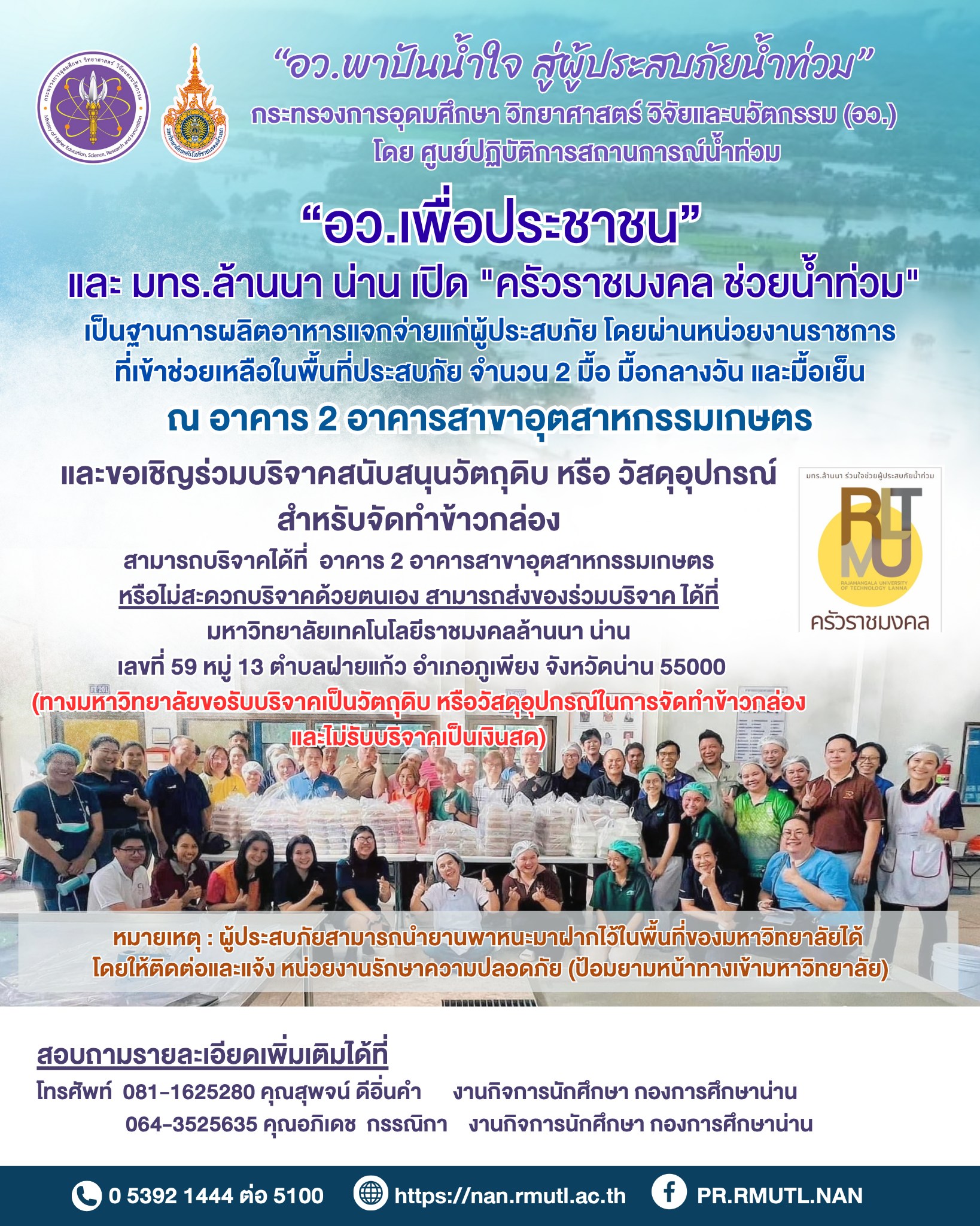 วันที่ 24 -28 กรกฎาคม 2568 อว.พาปันน้ำใจ สู่ผู้ประสบภัยน้ำท่วม 2568 กระทรวงการอุดมศึกษา วิทยาศาสตร์ วิจัยและนวัตกรรม (อว.) โดย ศูนย์ปฏิบัติการสถานการณ์น้ำท่วม และมหาวิทยาลัยเทคโนโลยีราชมงคลล้านนา น่าน รายงานโดย นางสาวศศิภา ชุมภูธิมา วันที่รายงาน 22/09/2568 [20050] |