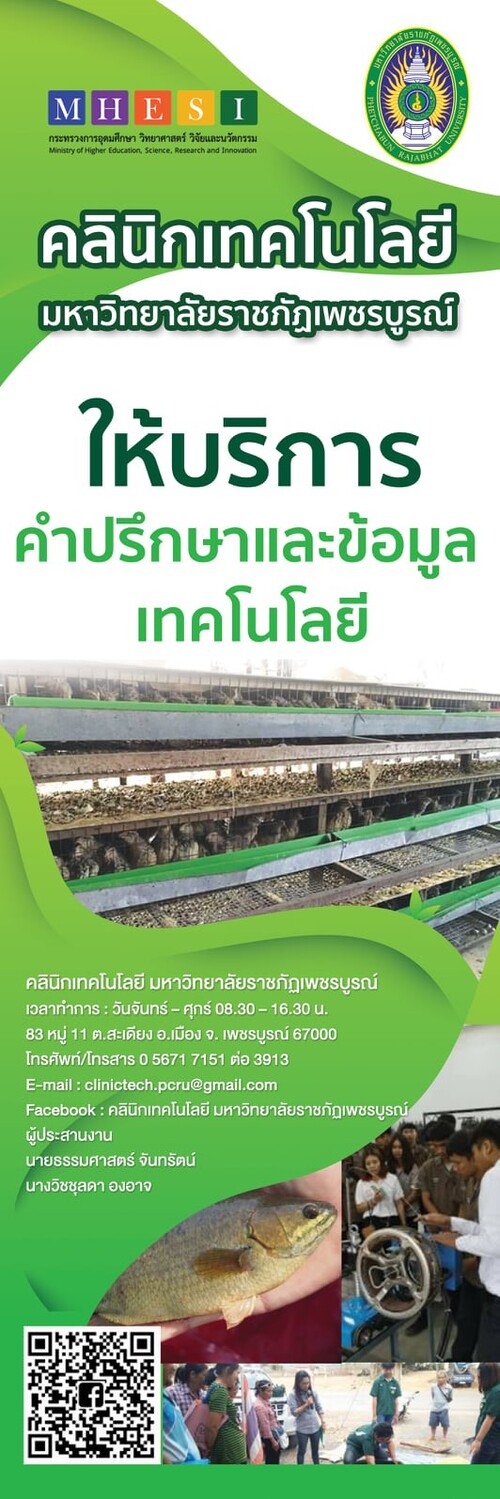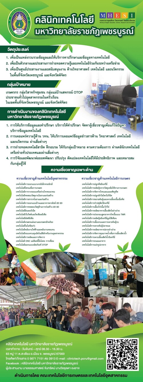 ผล 1. ผลลัพธ์ด้านการบริการและการถ่ายทอดเทคโนโลยี 1.1 ผู้รับบริการข้อมูลเทคโนโลยี ได้รับข้อมูลและองค์ความรู้ทางเทคโนโลยีที่เผยแพร่มีความน่าสนใจและเป็นที่ต้องการของชุมชนอย่างแท้จริง เป็นฐานสำคัญในการต่อยอดไปสู่การให้คำปรึกษาและการนำไปใช้ประโยชน์ต่อไป 1.2 ผู้รับบริการคำปรึกษาทางด้านเทคโนโลยี จำนวน 15 คน ได้รับแนวทางแก้ไขปัญหาที่เป็นรูปธรรม และได้รับคำแนะนำจากผู้เชี่ยวชาญ 1.3 การพัฒนาผลิตภัณฑ์ใหม่ มีศักยภาพในการสร้างอาชีพ สร้างรายได้ และ เพิ่มมูลค่าให้กับวัตถุดิบหรือกระบวนการในชุมชน เป็นการยกระดับเศรษฐกิจฐานราก 1.4 ความพึงพอใจของผู้รับบริการ ร้อยละ 91.50 แสดงว่าทีมงานมีความเชี่ยวชาญ การบริการเป็นมิตร และสามารถตอบสนองความต้องการของผู้รับบริการได้อย่างตรงจุด สร้างความเชื่อมั่นและเครือข่ายความร่วมมือในระยะยาว 1.5 เทคโนโลยีที่ถ่ายทอด มีความหลากหลาย และเป็นระบบ สามารถตอบโจทย์ความต้องการที่หลากหลายของพื้นที่ได้ ทำให้เกิดการกระจายความรู้ไปสู่กลุ่มอาชีพต่างๆ 1.6 ผู้นำความรู้ เทคโนโลยีที่ได้รับไปใช้ประโยชน์ เกิดการปฏิบัติและสร้างผลลัพธ์ที่แท้จริงของชุมชน 2. ผลลัพธ์ด้านการบริหารจัดการและเครือข่าย 2.1 มีความพร้อมด้านบุคลากร ที่จะให้คำปรึกษาและถ่ายทอดเทคโนโลยีที่มีคุณภาพสูงในหลากหลายสาขา 2.2 การเข้าร่วมกิจกรรมประชุมเครือข่ายคลินิกเทคโนโลยีส่วนกลาง ทำให้ได้รับข้อมูลนโยบายใหม่ๆ แลกเปลี่ยนประสบการณ์ และนำเทคโนโลยีใหม่ๆ จากเครือข่ายมาปรับใช้ในพื้นที่ได้ 2.3 การออกพื้นที่การให้บริการฯ ร่วมกับจังหวัดเพชรบูรณ์ จะเพิ่มในส่วนของการประชาสัมพันธ์และเข้าถึงกลุ่มเป้าหมาย รวมถึงการตอบสนองนโยบายของจังหวัด 2.4 มีบุคลากรช่วยให้การบริหารจัดการและการติดตามงานมีความต่อเนื่องและมีประสิทธิภาพ รองรับปริมาณงานบริการที่มีแนวโน้มสูงขึ้น 2.5 มีการกำกับดูแลโครงการ การประชุมการดำเนินงานให้เป็นไปตามแผน และมีการประเมินผลอย่างสม่ำเสมอ