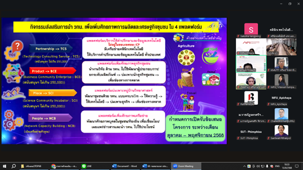 วันที่ 13 สิงหาคม 2568 เวลา 10.00 น. คลินิกเทคโนโลยี มหาวิทยาลัยราชภัฏยะลา นำโดย อาจารย์ ดร.อัจฉราพร ยกขุน ผู้จัดการคลินิกเทคโนโลยี พร้อมนางสาวลักษ์ขณาวดี ชุ่มแก้ว เจ้าหน้าที่บริหารงานทั่วไป คลินิกเทคโนโลยี เข้าร่วมรับฟังการชี้แจงหลักการกลไก ICP และการสมัครเข้าร่วมกลไกการส่งเสริมธุรกิจเทคโนโลยีและนวัตกรรมแบบบูรณาการ (Integrated Collaborative Platform - ICP) คือ กระบวนการที่ใช้ผลักดันให้เกิดการนำวิทยาศาสตร์ เทคโนโลยีและนวัตกรรมไปใช้ประโยชน์ โดยการบริหารจัดการงบประมาณในแพลตฟอร์มต่าง ๆ ดำเนินการภายใต้พื้นที่มุ่งเน้น (Focus Area) หรือ Technology Cluster ให้เกิดผลลัพธ์/ผลกระทบในวงกว้างและชัดเจน ผ่านระบบออนไลน์ Zoom Meeting ซึ่งจัดโดยกลุ่มส่งเสริมเทคโนโลยีและนวัตกรรม กองส่งเสริมและประสานเพื่อประโยชน์ทางวิทยาศาสตร์ วิจัยและนวัตกรรม สำนักงานปลัดกระทรวงการอุดมศึกษา วิทยาศาสตร์ วิจัยและนวัตกรรม รายงานโดย นางสาวลักษ์ขณาวดี ชุ่มแก้ว วันที่รายงาน 17/09/2568 [19971] |