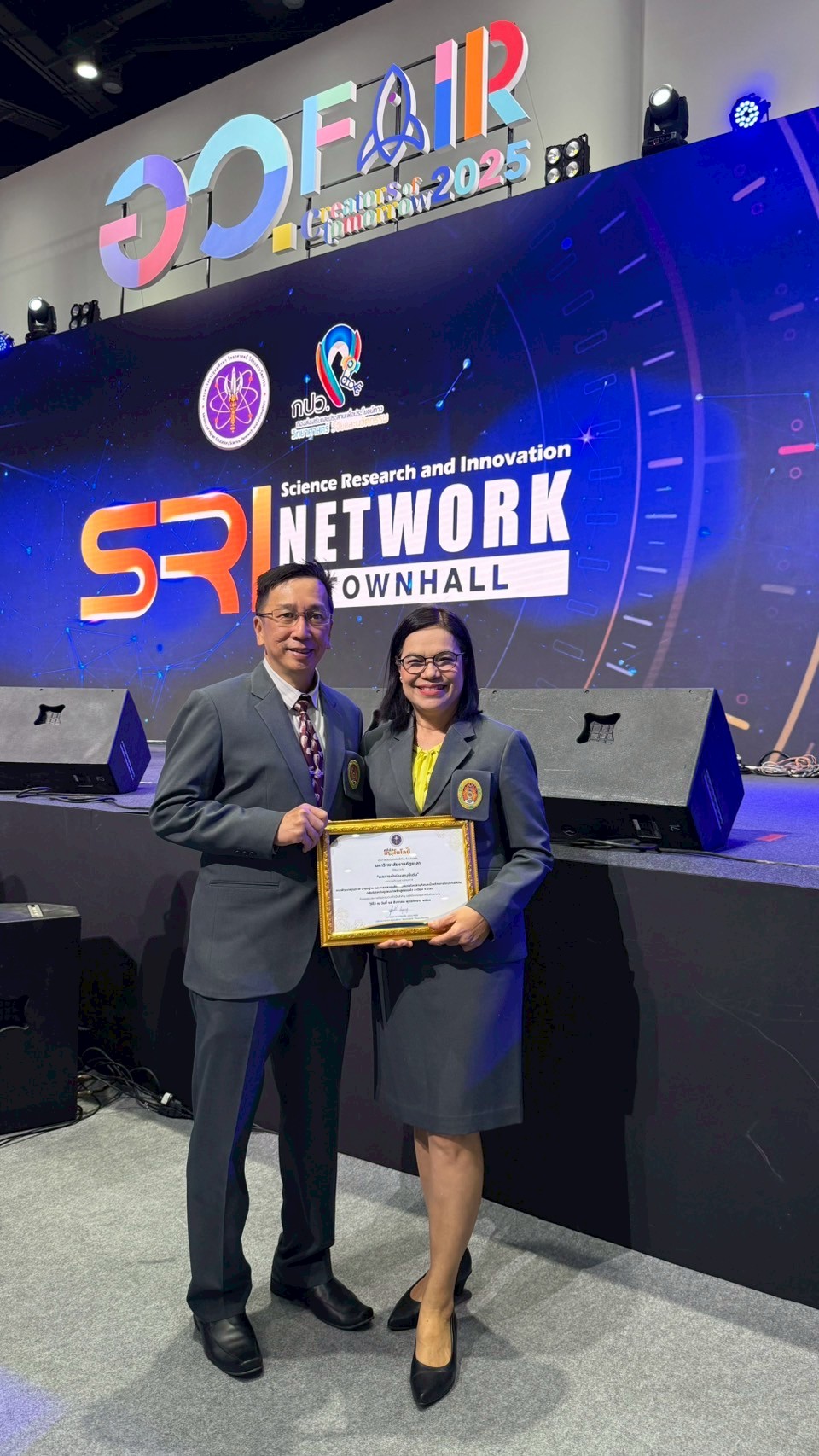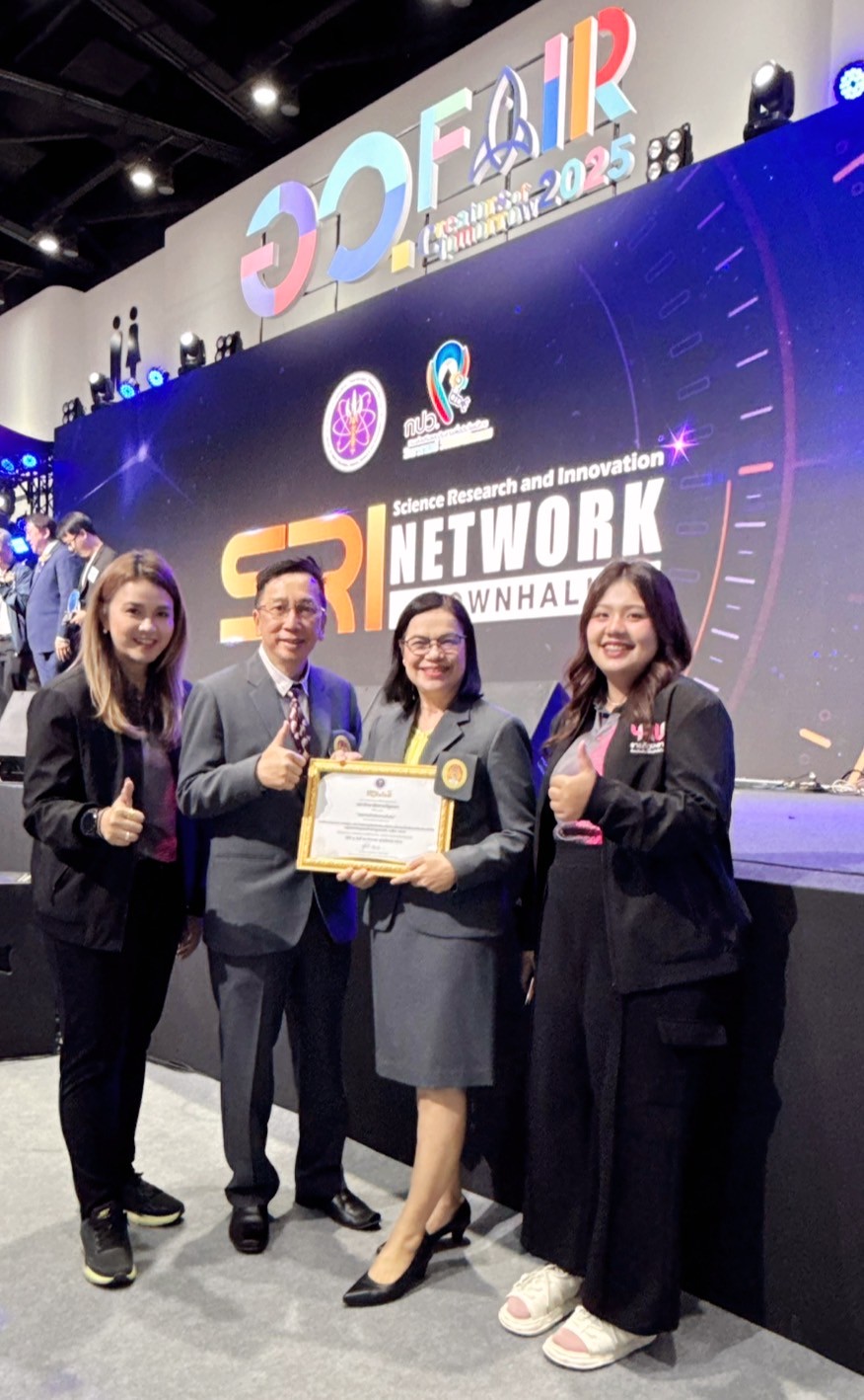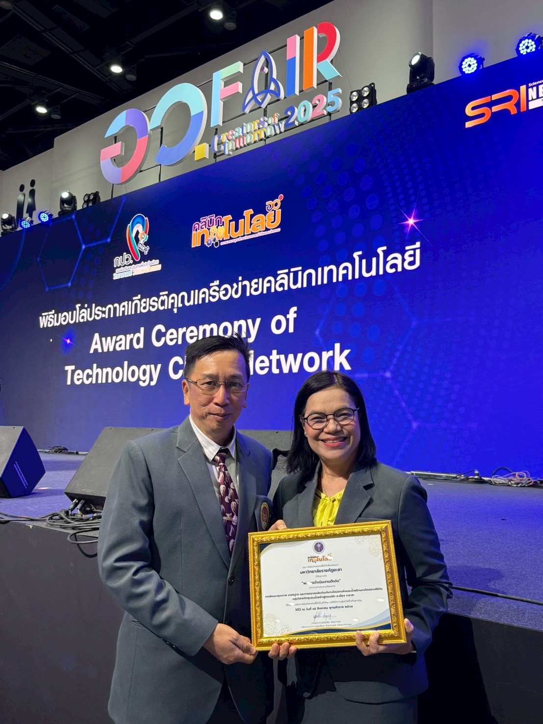 วันที่ 15 สิงหาคม 2568 นางสาวสุณีย์ เลิศเพียรธรรม รองปลัดกระทรวงการอุดมศึกษา วิทยาศาสตร์ วิจัยและนวัตกรรม (อว.) เป็นประธานเปิดกิจกรรมการส่งเสริมการใช้ประโยชน์ทางวิทยาศาสตร์ วิจัยและนวัตกรรม Science Research and Innovation (SRI) Network Townhall และมอบรางวัลให้กับหน่วยงานเครือข่ายและผู้ประกอบการ นักประดิษฐ์ ที่มีผลงานดีเด่น ภายในงาน อว.แฟร์ 2025 (SCI POWER FOR FUTURE THAILAND) โดยมี นายเอกพงศ์ มุสิกะเจริญ ผู้อำนวยการกองส่งเสริมและประสานเพื่อประโยชน์ทางวิทยาศาสตร์ วิจัยและนวัตกรรม (กปว.) กล่าวรายงาน ซึ่งคลินิกเทคโนโลยี มหาวิทยาลัยราชภัฏยะลา นำโดย อาจารย์ ดร.อัจฉราพร ยกขุน ผู้จัดการคลินิกเทคโนโลยี พร้อมนางสาวลักษ์ขณาวดี ชุ่มแก้ว เจ้าหน้าที่บริหารงานทั่วไป คลินิกเทคโนโลยี เข้าร่วมกิจกรรมฯ ณ เวทีกลาง ชั้น G ศูนย์การประชุมแห่งชาติสิริกิติ์ กรุงเทพมหานคร