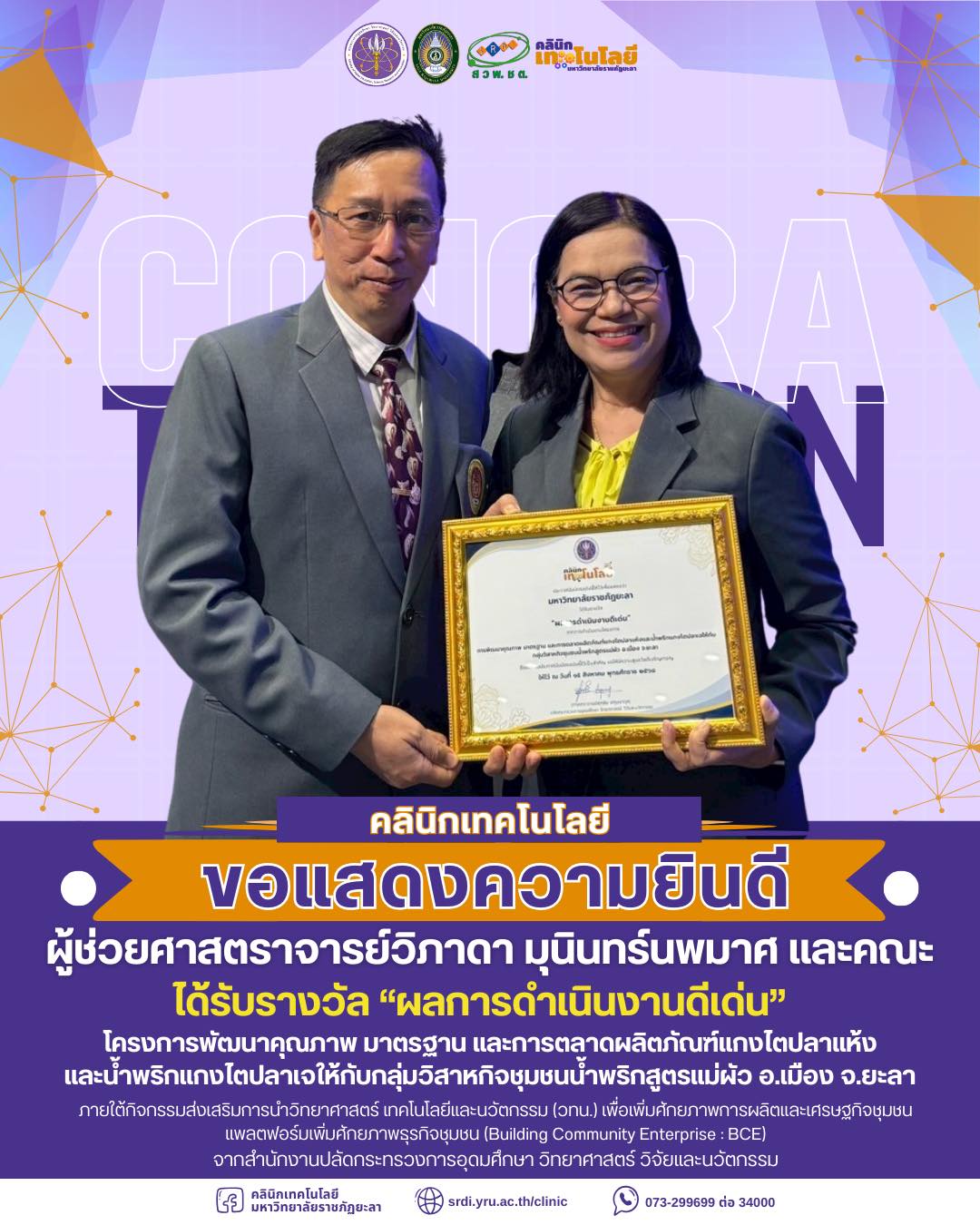 โดยมหาวิทยาลัยราชภัฏยะลา ได้รับรางวัลผลการดำเนินงานดีเด่น จากการดำเนินงานโครงการ “การพัฒนาคุณภาพ มาตรฐาน และการตลาดผลิตภัณฑ์แกงไตปลาแห้งและน้ำพริกแกงไตปลาเจให้กับกลุ่มวิสาหกิจชุมชนน้ำพริกสูตรแม่ผัว อ.เมือง จ.ยะลา” ภายใต้กิจกรรมส่งเสริมการนำวิทยาศาสตร์ เทคโนโลยีและนวัตกรรม (วทน.) เพื่อเพิ่มศักยภาพการผลิตและเศรษฐกิจชุมชน แพลตฟอร์มเพิ่มศักยภาพธุรกิจชุมชน (Building Community Enterprise : BCE) ซึ่งผู้ช่วยศาสตราจารย์วิภาดา มุนินทร์นพมาศ หัวหน้าโครงการ เข้าร่วมรับรางวัล