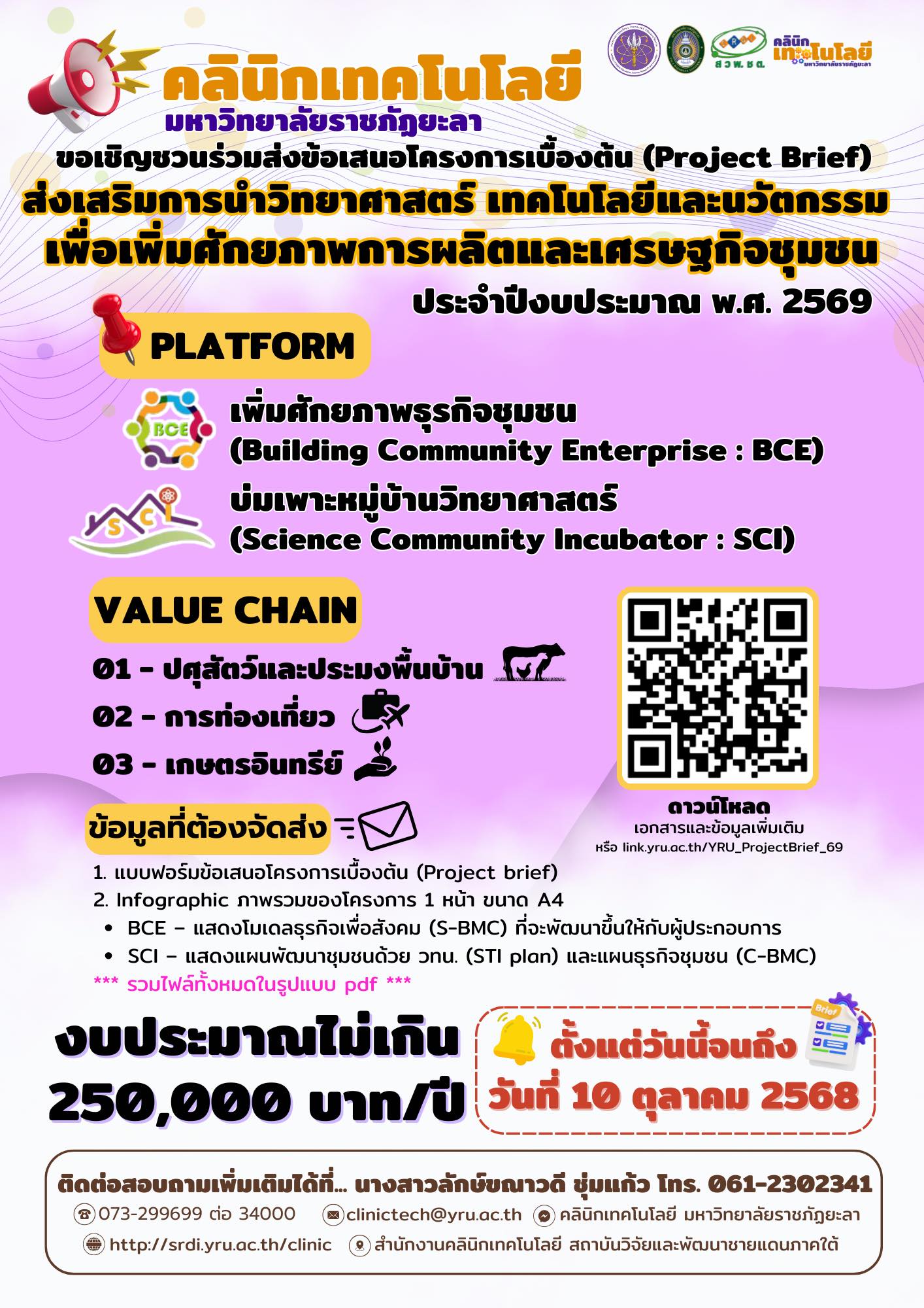 คลินิกเทคโนโลยี มหาวิทยาลัยราชภัฏยะลา แสดงความยินดีกับบุคลากร มหาวิทยาลัยราชภัฏยะลา ที่ได้รับงบประมาณสนับสนุนจากสำนักงานปลัดกระทรวงการอุดมศึกษา วิทยาศาสตร์ วิจัยและนวัตกรรมในการดำเนินงานโครงการตามแนวทางคูปองวิทย์เพื่อโอทอป ภายใต้โครงการพัฒนาผลิตภัณฑ์สินค้าชุมชน ประจำปีงบประมาณ พ.ศ. 2568 กลุ่มเป้าหมายกิจกรรมโอทอปสัญจร จำนวน 4 โครงการ กลุ่มเป้าหมายจากการประกาศรับสมัครทั่วประเทศ จำนวน 1 โครงการ และภายใต้กิจกรรมส่งเสริมการนำวิทยาศาสตร์ เทคโนโลยีและนวัตกรรม เพื่อเพิ่มศักยภาพการผลิตและเศรษฐกิจชุมชน ประจำปีงบประมาณ พ.ศ. 2568 : แพลตฟอร์มเพิ่มศักยภาพธุรกิจชุมชน (BCE) จำนวน 1 โครงการ งบประมาณรวมทั้งสิ้น 965,000 บาท