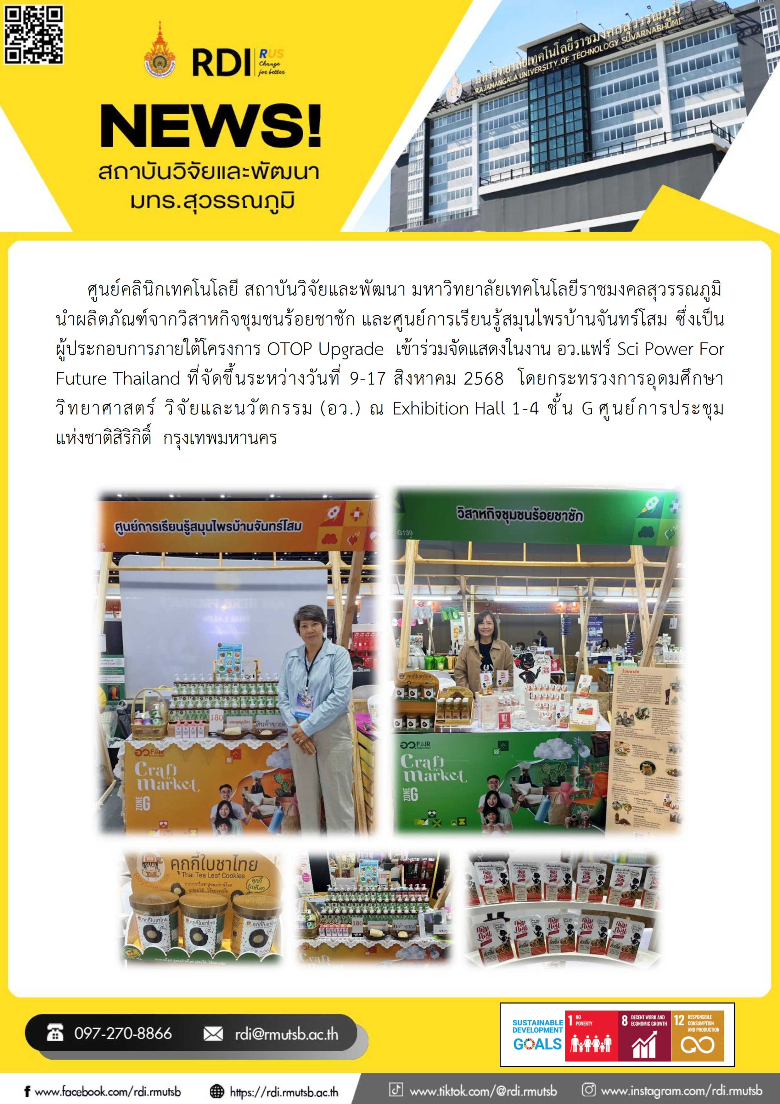 ระหว่างวันที่ 9 – 17 สิงหาคม 2568 ศูนย์คลินิกเทคโนโลยี สถาบันวิจัยและพัฒนา มหาวิทยาลัยเทคโนโลยีราชมงคลสุวรรณภูมิ ได้รับเกียรติบัตรผลการดำเนินงานดีเด่น จากการดำเนินงาน โครงการบริการคำปรึกษาและบริการข้อมูลด้านวิทยาศาสตร์และเทคโนโลยี (คลินิกเทคโนโลยี) ภายใต้การจัดกิจกรรม Science Research and Innovation (SRI) NETWORK TOWNHALL ณ เวทีกลาง ชั้น G ศูนย์การประชุมแห่งชาติสิริกิติ์ กรุงเทพมหานครพร้อมทั้งนำผลิตภัณฑ์ ข้าว กข 43และ POP Riceจากแพลตฟอร์มแพลตฟอร์มเพิ่มศักยภาพธุรกิจชุมชน (BCE)ร่วมจัดแสดงในโซนการจัดแสดงนิทรรศการเทคโนโลยีชุมชนผลิตภัณฑ์ เครื่องแกงคั่วกลิ้งตรากลมกลืน ร่วมจัดแสดงผลงานผลิตภัณฑ์ OTOP ที่ได้รับการพัฒนาภายใต้โครงการฯ เพื่อแสดงศักยภาพในการพัฒนาสินค้าด้วยวิทยาศาสตร์ เทคโนโลยีและนวัตกรรม พร้อมทั้งจัดนิทรรศการนำเสนอผลงาน/ผลิตภัณฑ์ ที่ร่วมพัฒนากับเครือข่าย จำนวน 3 ผลิตภัณฑ์ 1.สบู่เหลวสมุนไพร จันทร์โสม 2.น้ำมะม่วง 25%3.ไซรัปข้าวดำ จากโครงการคูปองวิทย์เพื่อโอทอป ในงานโครงการ การพัฒนาศักยภาพครู สกร. เพื่อเพิ่มขีดความสามารถของเครือข่ายในการนำงานด้าน ววน. พัฒนาพื้นที่ ภาคกลางและภาคตะวันออก รายงานโดย นางสาวชนาพร วัยทรง วันที่รายงาน 19/08/2568 [19733] |