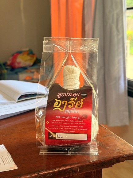 ลูกประคบสมุนไพร บรรเทาอาการปวดเมื่อยตามร่างกาย ราคาจำหน่าย 50 บาทต่ออัน จัดจำหน่ายโดยกลุ่มอาชีพแปรรูปสมุนไพรและบำบัดด้วยสมุนไพร จังหวัดอุตรดิตถ์