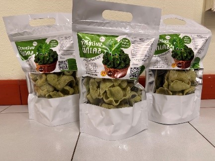 ข้าวเกรียบผักเคล ผลิตจากผักเคลปลอดสาร ผลิตและจำหน่ายโดยวิสาหกิจชุมชนเกษตรกรรมร่ำรวย มีมาตรฐานการผลิต อย. ราคาขาย 35-40 บาท