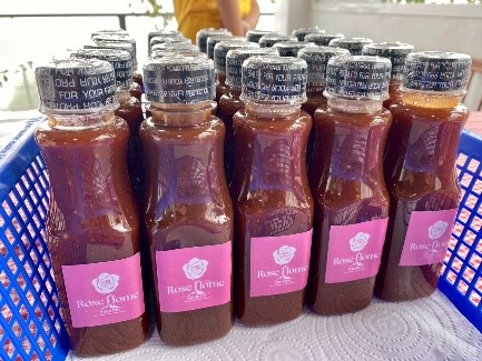 พัฒนาซอสมะแข่นให้สามารถยีดอายุการเก็บรักษาได้นานขึ้น ราคา 70 บาท/ขวด จำหน่ายโดยผู้ประกอบการที่พักโรสโฮม(Rose Home)