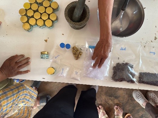 ภาพกิจกรรม การทำลูกประคบ วัตถุดิบ สัดส่วนที่ใช้ ฝึกมัดลูกประคบของกลุ่มชุมชนบ้านไตรรัตน์โดย วิทยากรจาก อดีตผู้ใหญ่ บำรุง มะทะเอ