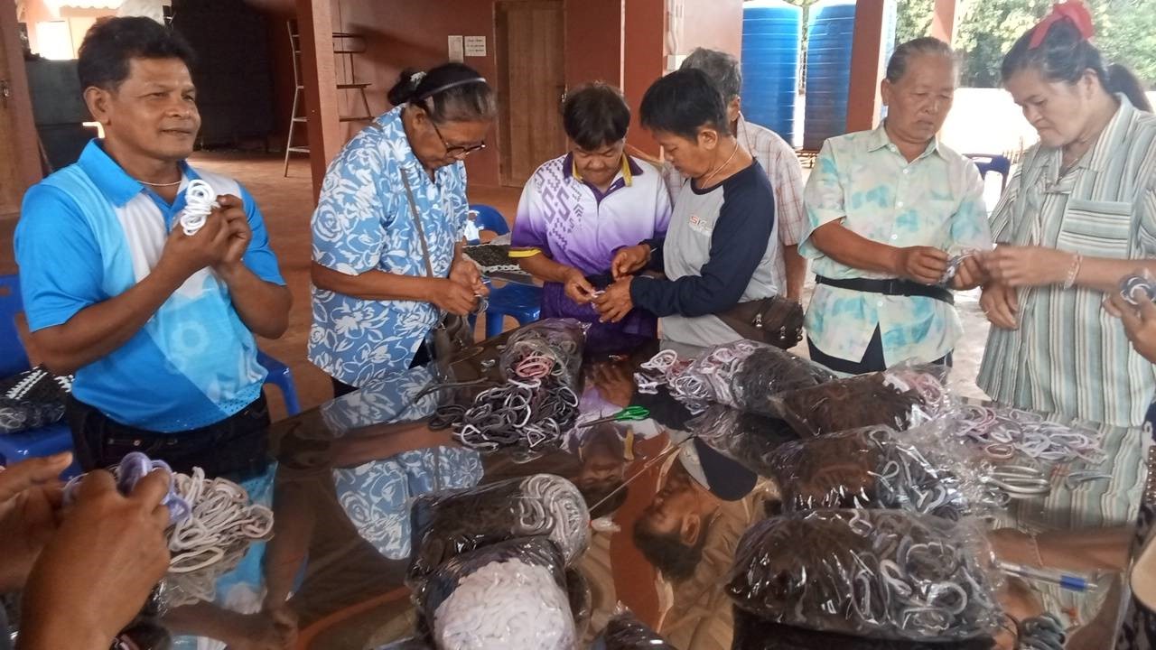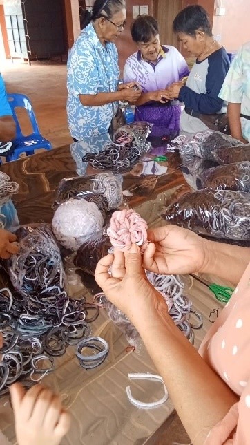 ภาพกิจกรรม การทำพรหมเช็ดเท้า วัสดุ อุปกรณ์ที่ใช้ ของกลุ่มชุมชนบ้านไตรรัตน์โดย วิทยากรจาก ผู้ใหญ่ยอด อิ่มพลับ
