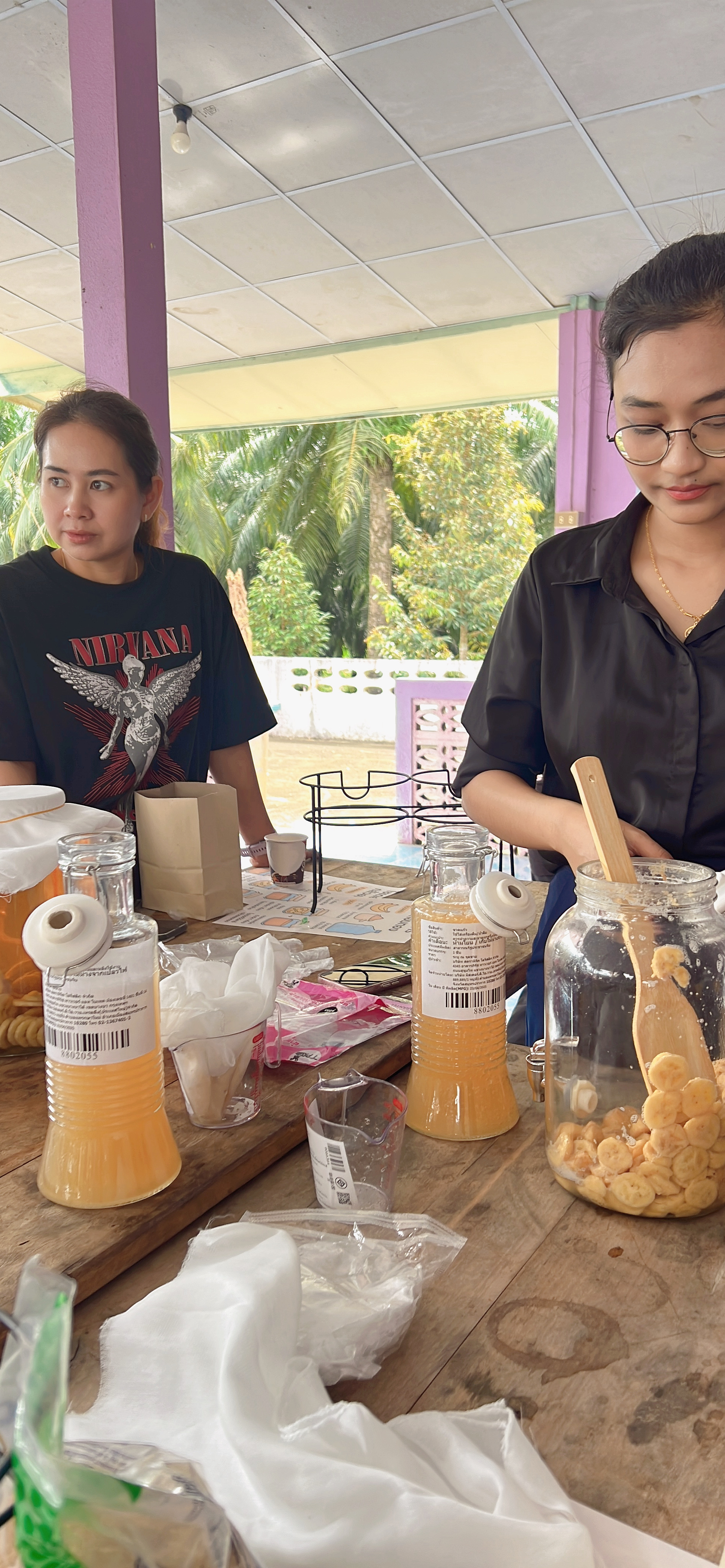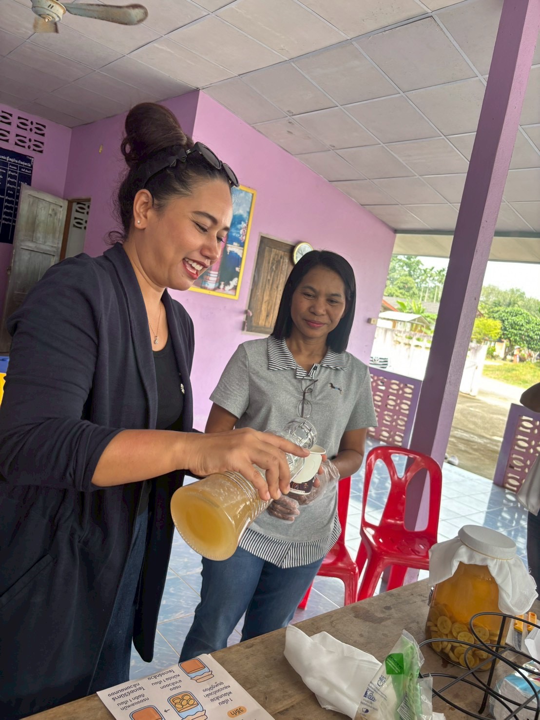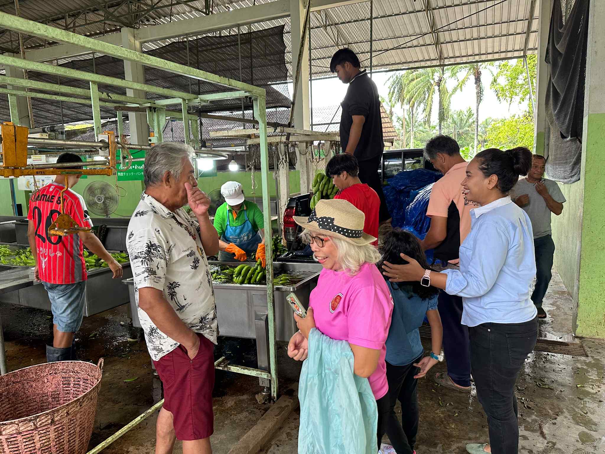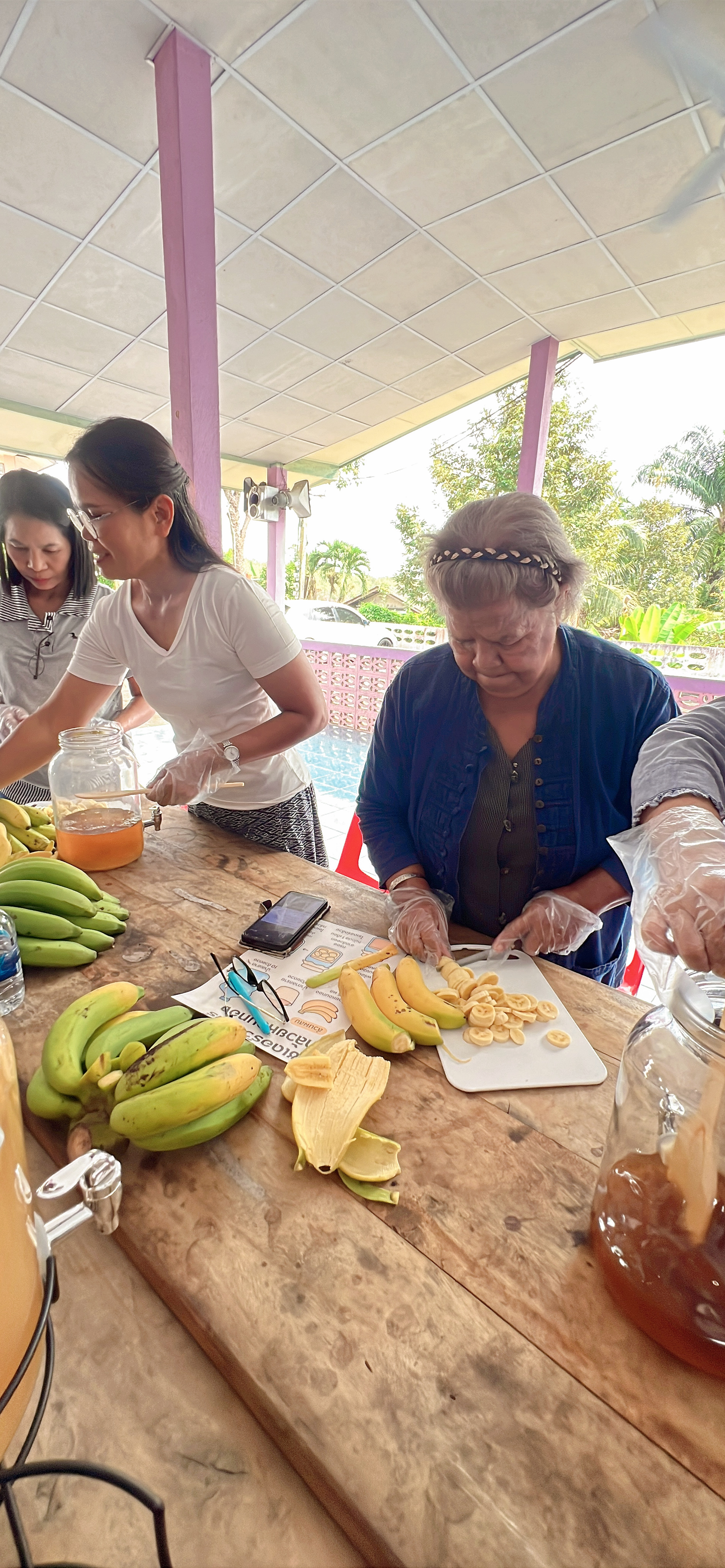 รายงานผลการปฏิบัติการ วันที่ 1 สิงหาคม 2568 โครงการกล้วยหอมทองไซเดอร์ อำเภอละแม จังหวัดชุมพร ผศ.ดร.มัลลิกา จินดาซิงห์ และคณะได้ลงพื้นที่หมู่บ้านกล้วยหอมทองไซเดอร์ เพื่อดำเนินการประชุมกับประธานกลุ่ม นางชัชญา โอ๋พั่ง และสมาชิกกลุ่มเพื่อสร้างความเข้าใจเกี่ยวกับกระบวนการและขั้นตอนกระบวนการดำเนินโครงการ การสร้างหมู่บ้านกล้วยหอมทองละแมครบวงจร เพื่อใช้ประโยชน์จากต้นกล้วยหอมทองครบทุกส่วน เพื่อมุ่งสู่ Zero waste และวัตถุประสงค์ในการดำเนินโครงการเพื่อถ่ายทอดองค์ความรู้ทางด้านวิทยาศาสตร์และเทคโนโลยีให้เป็นหมู่บ้านกล้วยหอมละแมครบวงจร เพื่อใช้ประโยชน์จากต้นกล้วยหอมทองครบทุกส่วน เพื่อมุ่งสู่ Zero wast การส่งเสริมและพัฒนาการแปรรูปผลิตภัณฑ์พื้นถิ่นกล้วยหอมทอง ด้วยการประยุกต์ใช้ภูมิปัญญานวัตกรรมและเทคโนโลยีอย่างปลอดภัย และการสร้างอัตลักษณ์หรือนำเสนอเรื่องราวเกี่ยวกับแหล่งกำเนิดให้กับสินค้า สร้างความแตกต่างและความ โดดเด่นของสินค้า รวมถึงการสร้างตราสินค้า ฉลาก และบรรจุภัณฑ์