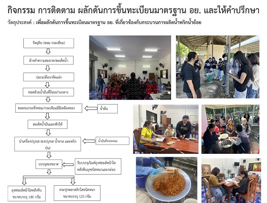 กิจกรรมที่ 3 การติดตาม ผลักดันการขึ้นทะเบียนมาตรฐาน อย. และให้คำปรึกษา การติดตาม ผลักดันการขึ้นทะเบียนมาตรฐาน อย. และให้คำปรึกษา ดำเนินกิจกรรมในระหว่างวันที่ 30 พฤศจิกายน 2568 - วันที่ 26 ธันวาคม 2568 นำโดย ผู้ช่วยศาสตราจารย์ ดร.อิศรา วัฒนนภาเกษม หัวหน้าโครงการ พร้อมด้วยคณะทำงาน ได้จัดกิจกรรมที่ 3เพื่อการติดตาม ผลักดันการขึ้นทะเบียนมาตรฐาน อย. และให้คำปรึกษา โดยวันที่ 30 พฤศจิกายน 2568 และ วันที่ 1ธันวาคม 2568 ผู้ช่วยศาสตราจารย์ ดร.อิศรา วัฒนนภาเกษม เป็นวิทยากร และมีอาจารย์ ดร.ศุกรี อยู่สุข ดร. วรศิลป์ มาลัยมทอง และนางสุรัลชนา มะโนเนือง เป็นทีมผู้ช่วยวิทยากรภาคปฏิบัติการ ดำเนินการอบรมจัดทำเอกสาร เพื่อผลักดันการขึ้นทะเบียนมาตรฐาน อย. ที่เกี่ยวข้องกับกระบวนการผลิตน้ำพริกน้ำย้อย และปรับปรุงอาคารสถานที่ผลิต ณ ศาลาอเนกประสงค์ เลขที่ 2 หมู่ 10 ตำบลบ้านถิ่น อำเภอเมือง จังหวัดแพร่ผู้เข้ารร่วมกิจกรรมจำนวน 29 คน ผลลัพธ์ คือ สมาชิกร่วมด้วยช่วยกันในการดำเนินการจัดทำข้อมูลเกี่ยวข้องกับกระบวนการผลิตน้ำพริกน้ำย้อย รวมถึงการปรับปรุงและเตรียมสถานที่ผลิต เพื่อให้เหมาะสมสำหรับการยื่นของสถานที่ผลิตอาหาร เช่น การปรับเปลี่ยนฝ้าเพดาน ที่มีเชื้อราเก่า เปลี่ยนเป็นฝ้าเพดานแผ่นเรียบ เป็นต้น เพื่อเตรียมการเข้าตรวจเยี่ยมของสาธารณสุขจังหวัด วันที่ 25 และ 26 ธันวาคม 2568 ผู้ช่วยศาสตราจารย์ ดร.อิศรา วัฒนนภาเกษม หัวหน้าโครงการ นำข้อมูลรายละเอียดต่าง ๆ ของสถานที่ผลิตมาออกแบบแบบแปลนสำหรับสถานที่ผลิต ผลิตภัณฑ์น้ำพริกน้ำย้อย จากนั้นนำข้อมูลแบบแปลนยื่นแบบที่สาธารณสุขจังหวัดแพร่ เพื่อขอข้อเสนอแนะและปรับแก้ไขแบบให้ได้มาตรฐาน จากนั้นนำโครงสร้างแบบแปลนของสถานที่ผลิตที่ผ่าน ถ่ายถอดให้กับสมาชิกกลุ่มได้ทราบแนวทางและกระบวนการยื่นขอมาตรฐาน อย. สำหรับการตรวจสอบความปลอดภัยของผลิตภัณฑ์ ทำการตรวจสอบจำนวนเชื้อจุลินทรีย์ทั้งหมด เชื้อยีสต์และรา และ Escherichia coli รวมทั้งการตรวจวิเคราะห์ปริมาณแบคทีเรียก่อโรค ได้แก่ Clostridium perfringens, Bacillus cereus, Salmonellaspp., Staphylococcus aureusพบว่า ตัวอย่างผลิตภัณฑ์น้ำพริกพน้ำย้อย มีผลตรวจสอบคุณภาพทางด้านจุลินทรีย์ที่ระบุตามเกณฑ์คุณภาพทางจุลชีววิทยาของอาหารและภาชนะสัมผัสอาหาร ฉบับที่ 3 พ.ศ. 2560 (ประกาศกรมวิทยาศาสตร์การแพทย์, 2560) ข้อที่ 2 เรื่อง อาหารที่ผ่านกระบวนการทำให้แห้งที่มีปริมาณน้ำอิสระในอาหาร (aw) น้อยกว่า 0.86 มีคุณภาพทางจุลชีววิทยาอยู่ในเกณฑ์คุณภาพที่ดี และไม่พบจุลินทรีย์เกินมาตรฐาน และยังอ้างถึงเกณฑ์จำนวน E. coli ทั้งหมด ตามคำแนะนำของอาหารพร้อมบริโภ