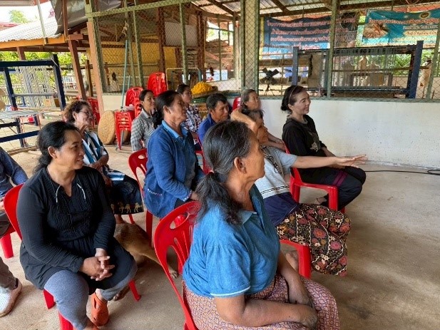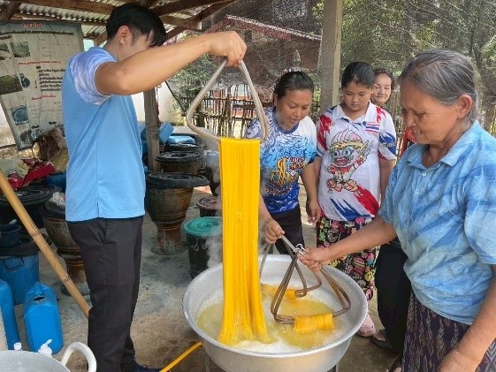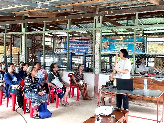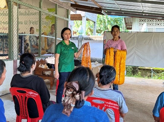 กิจกรรมที่ 2 การอบรมเชิงปฏิบัติการการผลิตเส้นไหมพันธุ์ไทยพื้นบ้าน (นางอ่อนโยน) รายละเอียดกิจกรรม เนื้อหาของกิจกรรมอบรมเน้นให้ผู้เข้าร่วมเรียนรู้ภาพรวมของการผลิตเส้นไหมพันธุ์ไทยพื้นบ้านอย่างเป็นระบบ ตั้งแต่ความเข้าใจเบื้องต้นเกี่ยวกับพันธุ์ไหม “นางอ่อนโยน” ลักษณะเด่น จุดแข็ง และความเหมาะสมในการนำไปแปรรูปเป็นผ้าไหมย้อมคราม ไปจนถึงการปฏิบัติในขั้นตอนการเลี้ยงไหม การสางรัง การสาวไหม และการควบคุมคุณภาพของเส้นไหมให้สอดคล้องกับมาตรฐาน มกษ. กิจกรรมยังมุ่งสร้างความเข้าใจต่อวิถีการผลิตที่ใช้ทรัพยากรธรรมชาติในท้องถิ่น และสอดคล้องกับแนวคิด BCG economy ที่ให้ความสำคัญกับความยั่งยืนและการใช้ทรัพยากรอย่างคุ้มค่า จึงทำให้กิจกรรมนี้เป็นทั้งการเรียนรู้ทักษะเชิงช่าง และการสร้างความตระหนักรู้เกี่ยวกับคุณค่าของพันธุ์ไหมพื้นบ้านในบริบทของชุมชนบ้านกลาง วิธีการดำเนินงาน การดำเนินงานในกิจกรรมนี้ใช้รูปแบบ “การเรียนรู้เชิงปฏิบัติการ” ที่ให้ชุมชนได้ลงมือทำจริงควบคู่กับการฟังบรรยาย ผู้เชี่ยวชาญด้านเส้นไหมและพันธุ์ไหมพื้นบ้านเป็นผู้ถ่ายทอดทั้งความรู้ทฤษฎีและการสาธิตทีละขั้นตอน ขณะที่สมาชิกในชุมชนได้รับโอกาสจับรังไหม สาวไหม และตรวจคุณภาพเส้นไหมด้วยตนเอง วิธีการนี้ช่วยให้ผู้อบรมเข้าใจความแตกต่างระหว่างเส้นไหมพันธุ์ไทยกับพันธุ์ลูกผสมที่เคยใช้ในชุมชน ทั้งในด้านสี ความเหนียว ความละเอียด และความสม่ำเสมอของเส้น นอกจากนั้นยังเป็นรูปแบบฝึกปฏิบัติที่สอดคล้องกับวิธีการสืบทอดภูมิปัญญาดั้งเดิม ทำให้ผู้เข้าร่วมสามารถเชื่อมโยงองค์ความรู้ใหม่เข้ากับประสบการณ์เดิมของชุมชนได้อย่างเป็นธรรมชาติ รูปแบบการอบรมยังเปิดโอกาสให้สมาชิกได้แลกเปลี่ยนความคิดเห็น ซักถามข้อสงสัย และสะท้อนปัญหาที่เคยเจอในการเลี้ยงไหมหรือสาวไหมตามวิถีเดิม ซึ่งทำให้วิทยากรสามารถอธิบายเชื่อมโยงสาเหตุของปัญหาเข้ากับหลักวิชาการได้อย่างเหมาะสม ทำให้การเรียนรู้ไม่ใช่เพียงการถ่ายทอด แต่เป็นกระบวนการร่วมสร้างองค์ความรู้ระหว่างผู้เชี่ยวชาญและชุมชน โดยมีพันธุ์ไหม “นางอ่อนโยน” เป็นหัวใจสำคัญของการพัฒนา ขั้นตอนการดำเนินงาน ขั้นตอนการดำเนินงานของกิจกรรมนี้เริ่มจากการเตรียมการเรียนรู้ด้านทฤษฎี เพื่อให้ผู้เข้าอบรมมีความเข้าใจเกี่ยวกับพันธุ์ไหมพื้นบ้านอย่างถูกต้อง ก่อนเข้าสู่กระบวนการฝึกปฏิบัติจริงในทุกช่วงของการผลิตเส้นไหม เช่น การเตรียมโรงเลี้ยงไหมที่เหมาะสม การให้อาหารด้วยใบหม่อน การดูแลอุณหภูมิและความ