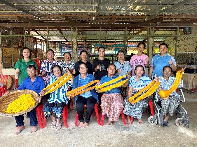 กิจกรรมที่ 4 การอบรมเชิงปฏิบัติการเกี่ยวกับการแปรรูปผลิตภัณฑ์ผ้าไหมย้อมครามนางอ่อนโยน รายละเอียดกิจกรรม กิจกรรมนี้มุ่งเน้นการสร้างความเข้าใจเกี่ยวกับการแปรรูปผลิตภัณฑ์ผ้าไหมในเชิงสร้างสรรค์ ผ่านการผสมผสานภูมิปัญญาดั้งเดิมของการย้อมครามเข้ากับแนวคิดการออกแบบร่วมสมัย เพื่อเพิ่มโอกาสในตลาดผ้าไหมให้ผู้บริโภคยุคใหม่มีตัวเลือกเกี่ยวกับผ้าไหมย้อมครามมากขึ้น ผู้เข้าอบรมได้รับความรู้เกี่ยวกับการเลือกใช้ผ้าไหมในลักษณะต่าง ๆ การกำหนดรูปแบบผลิตภัณฑ์ เช่น ผ้าพันคอ เสื้อคลุม ผ้าคลุมไหล่ กระเป๋าผ้า หรือของใช้เชิงหัตถกรรมอื่น ๆ ตลอดจนแนวคิดการออกแบบลวดลาย การจัดวางแพทเทิร์น และการตัดเย็บที่เหมาะสมกับคุณสมบัติของผ้าไหมย้อมคราม นอกจากนี้ กิจกรรมยังเชื่อมโยงไปถึงความจำเป็นในการสร้างผลิตภัณฑ์ตามมาตรฐานตลาด เช่น ความทนทาน การเย็บที่ประณีต และการออกแบบที่เหมาะต่อการใช้งานจริง พร้อมทั้งแนะนำการจัดทำบรรจุภัณฑ์และการกำหนดมูลค่าอย่างเหมาะสม เพื่อให้ผลิตภัณฑ์ได้รับการยอมรับมากขึ้นในมิติของความงาม ความเป็นประโยชน์ใช้สอย และคุณค่าทางวัฒนธรรม วิธีการดำเนินงาน การดำเนินงานของกิจกรรมเน้นรูปแบบ “อบรมและลงมือปฏิบัติจริง” เป็นหลัก ผู้เข้าร่วมอบรมได้ทำงานร่วมกับวิทยากรผู้เชี่ยวชาญด้านการออกแบบและแปรรูปผลิตภัณฑ์ โดยเริ่มจากการทำความเข้าใจศักยภาพของผ้าไหมในชุมชนของตนเอง และค้นหาจุดแข็งของผ้าไหมย้อมครามจากเส้นไหมพันธุ์ไทยพื้นบ้านซึ่งมีความละเอียดและพื้นผิวสัมผัสเป็นเอกลักษณ์ หลังจากนั้นวิทยากรจะอธิบายแนวคิดการออกแบบผลิตภัณฑ์อย่างเป็นระบบ ทั้งด้านความสวยงาม การใช้งาน และความสะดวกในการผลิต ก่อนพาผู้เข้าร่วมอบรมลงมือทำต้นแบบจริงในรูปแบบผลิตภัณฑ์ต่าง ๆ รูปแบบการเรียนรู้เน้นการทดลองปรับเปลี่ยนรูปแบบผลิตภัณฑ์ให้เหมาะสมกับผ้าไหมย้อมคราม เช่น การเลือกเทคนิคตัดเย็บที่ไม่ทำลายเนื้อผ้า การจัดการเศษผ้าอย่างคุ้มค่า และการดึงจุดเด่นของสีครามออกมาให้ชัดเจนในตัวผลิตภัณฑ์ ผู้เข้าร่วมอบรมได้ทดลองตัดเย็บในชิ้นงานต้นแบบ จนเริ่มเข้าใจความสัมพันธ์ระหว่าง “ความเป็นผ้าไหมพื้นบ้าน” กับ “ความเป็นผลิตภัณฑ์ร่วมสมัย” ซึ่งเป็นแนวคิดสำคัญในการยกระดับสินค้าให้มีเอกลักษณ์และมีตลาดรองรับมากขึ้น ขั้นตอนการดำเนินงาน การดำเนินงานเริ่มต้นจากการวิเคราะห์ผ้าไหมที่ผ่านกระบวนการทอและย้อมครามว่ามีคุณลักษณะใดเหมาะต่อการแปรรูป เช่น ความหนาแน่นของเนื้อผ้า ความลื่นของเส้นไหม และความคงทนของ
