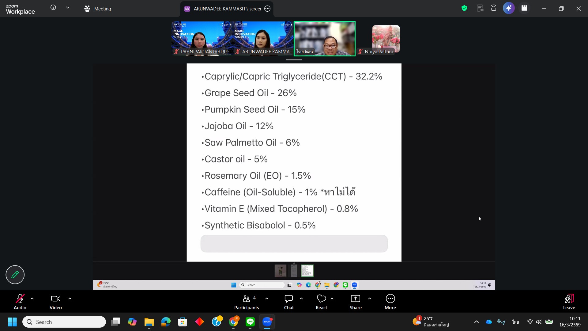 กิจกรรมให้คำปรึกษา ผู้ประกอบการอยากปรึกษาเรื่องสูตร hair oil ที่มีส่วนผสมและสารสกัดบำรุงผมและป้องกันผมร่วงที่ทำจากโรสแมรี่ออยล์ อาจารย์ได้แนะนำเรื่องการปรับส่วนผสม - เพิ่ม Costor oil ไม่เกิน 10% - เปลี่ยนจาก Caffeine เป็น Peppermint 0.5 – 1% - เพิ่ม Rosemary oil เป็น 2% - ลดส่วนผสมของ Saw Palmetto oil เนื่องจากเป็นส่วนผสมที่มีต้นทุนสูง และยังแนะนำให้สกัดโรสแมรี่ออยล์ ด้วยแอลกอฮอล์ ซึ่งสามารถขึ้นทะเบียนเป็นสูตรใหม่ได้อีกด้วย รายงานโดย นายวันโชค มณีเดช วันที่รายงาน 02/04/2569 [21387] |