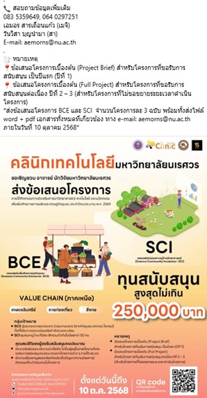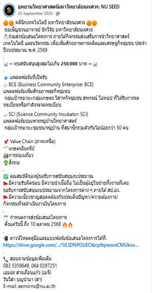 กิจกรรมอื่น ๆ 1. การประชาสัมพันธ์ช่องทางการรับบริการ - ช่องทาง Online ประชาสัมพันธ์ผ่าน Website และ Social Network ของอุทยานวิทยาศาสตร์มหาวิทยาลัยนเรศวร ดังนี้ - Facebook Fanpage: อุทยานวิทยาศาสตร์มหาวิทยาลัยนเรศวร: NU SEED ประชาสัมพันธ์เชิญชวนอาจารย์ นักวิจัย มหาวิทยาลัยนเรศวร ร่วมส่งข้อเสนอโครงการ ภายใต้กิจกรรมส่งเสริมการนำวิทยาศาสตร์ เทคโนโลยี และนวัตกรรม เพื่อเพิ่มศักยภาพการผลิตและเศรษฐกิจชุมชน ประจำปีงบประมาณ พ.ศ. 2569 ทุนสนับสนุนสูงสุดไม่เกิน 250,000 บาท 1. แพลตฟอร์ม BCE (Business Community Enterprise: BCE) แพลตฟอร์มเพิ่มศักยภาพธุรกิจชุมชน กลุ่มเป้าหมาย คือ กลุ่มเกษตร วิสาหกิจชุมชน สหกรณ์ โอทอป ที่ได้รับการจดทะเบียนหรือกำลังจะจดทะเบียน 2. แพลตฟอร์ม SCI (Science Community Incubator: SCI) แพลตฟอร์มบ่มเพาะหมู่บ้านวิทยาศาสตร์ กลุ่มเป้าหมาย คือ ชุมชน/หมู่บ้าน ที่สมาชิกรวมตัวกันไม่น้อยกว่า 50 คน ภาพกิจกรรม รายงานโดย น.ส.เอมอร สารเถื่อนแก้ว วันที่รายงาน 05/04/2569 [21555] |